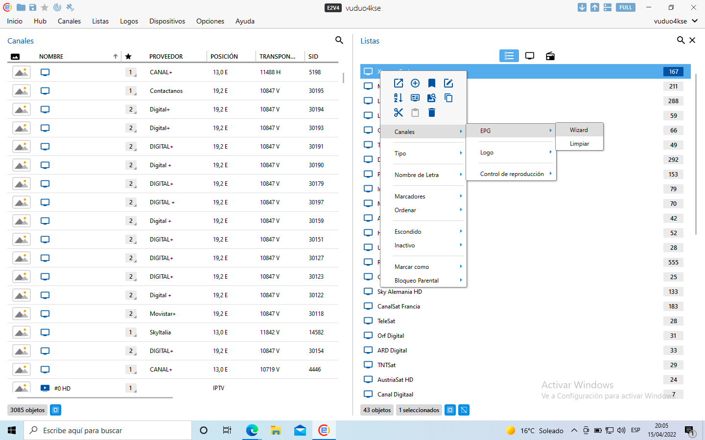 7. Pulsamos boton derecho sobre el mismo, seleccionamos canales-EPG-wizard