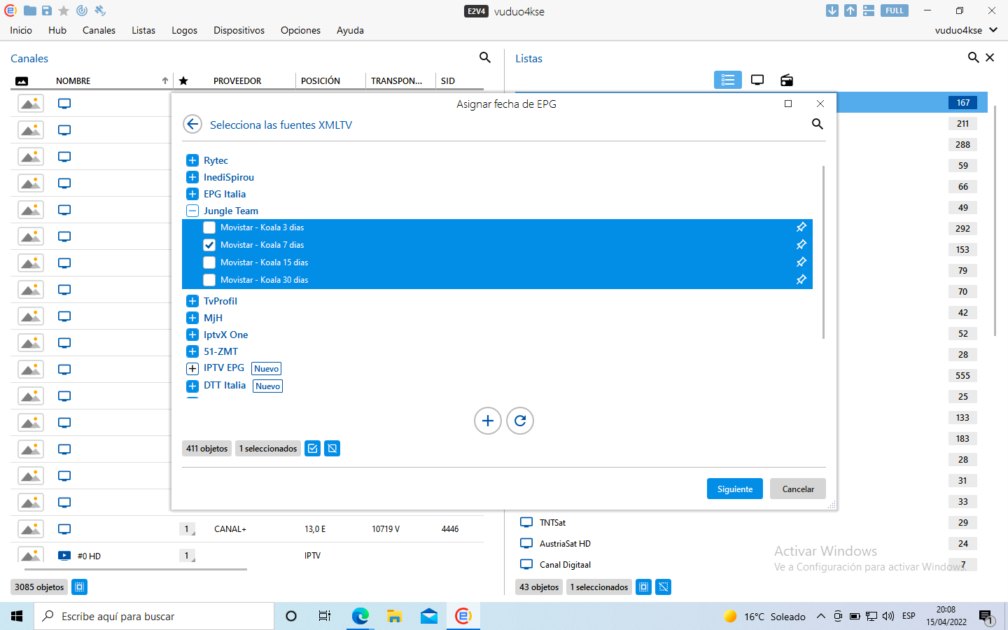 9. Ahora nos apareceran los proveedores epg que el creador del programa a añadido entre ellos se halla jungle-team que es el epg que realizamos llamado koala