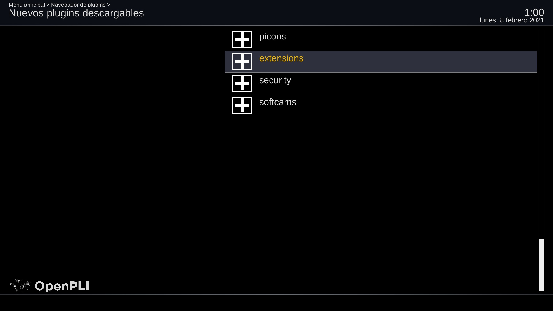 1. Pulsamos en menu + Plugins + boton verde y seleccionamos extensions