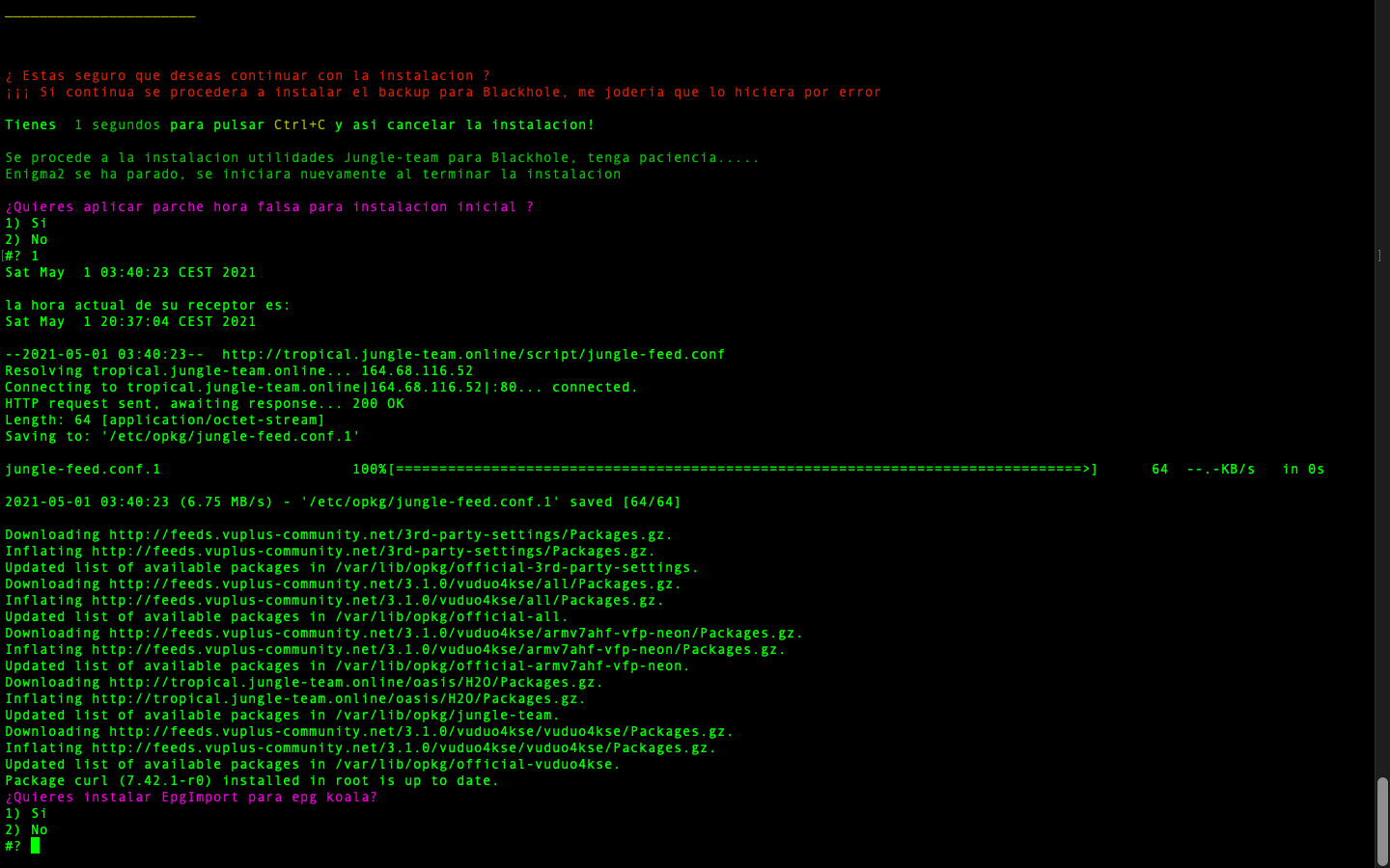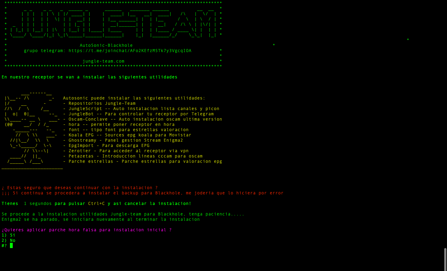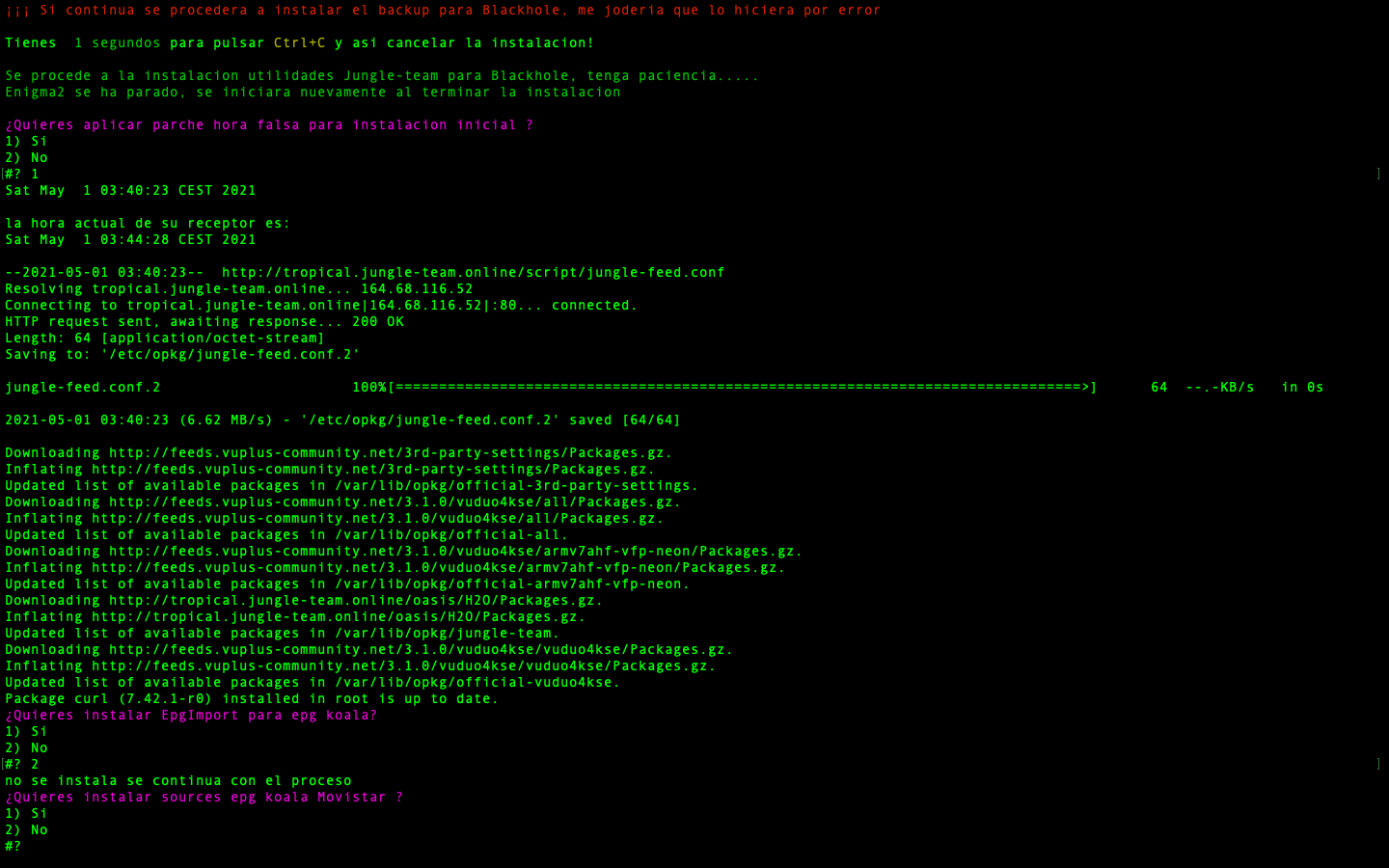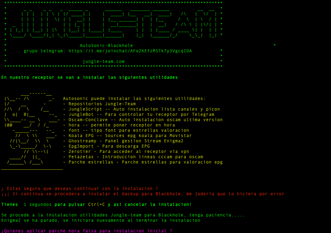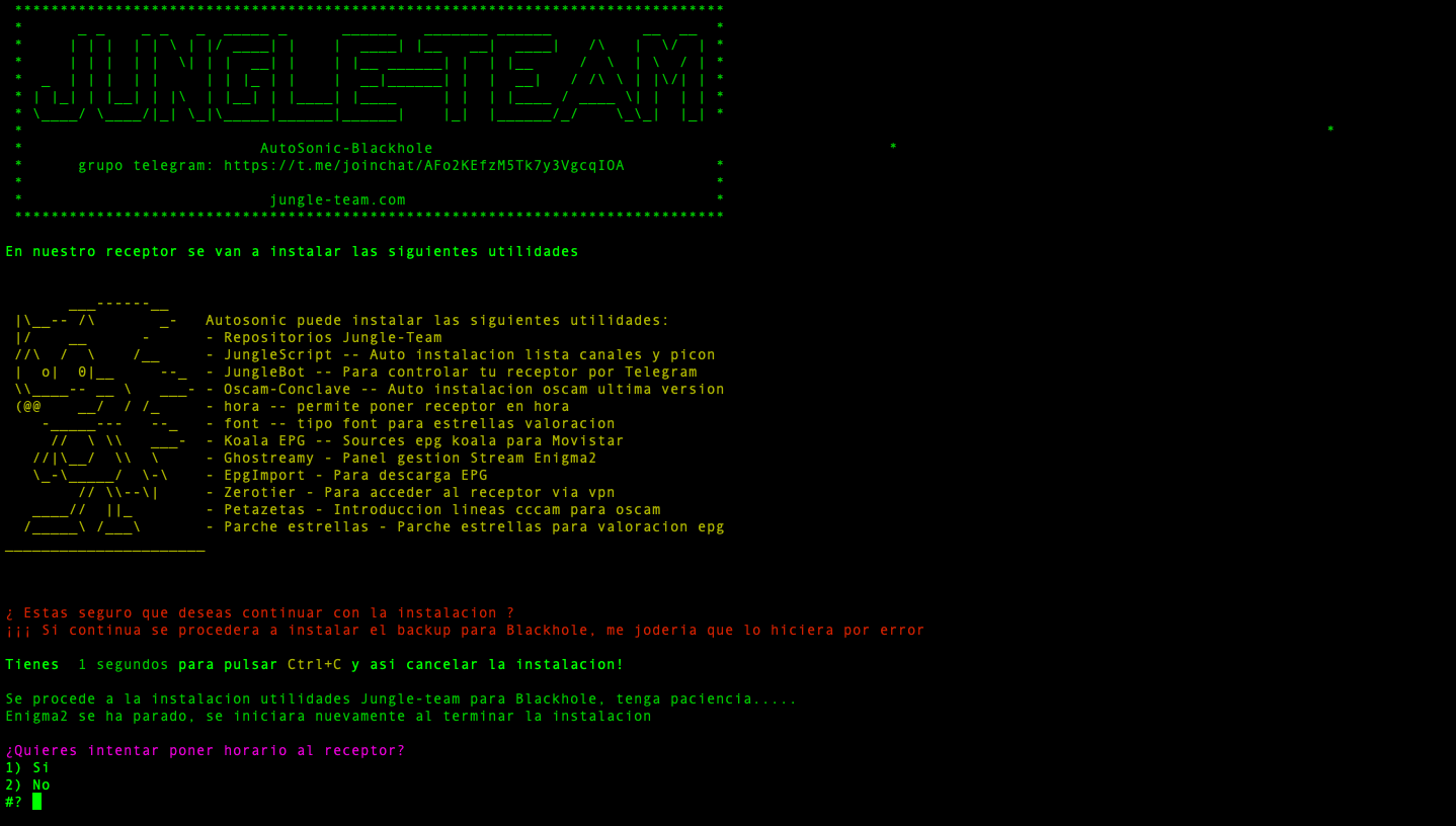 Una vez comience la instalacion de utilidades nos ira solicitando poder seleccionar si deseamos instalar o no por cada uno de los paquetes, comezando si deseamos poner en hora el receptor (sobre todo para instalaciones limpias, para que no falle la instalacion por problemas de no tener el receptor el horario puesto, como blackhole no tiene la opcion de nptdate se realiza un parcheo de hora poniendo una hora predeterminada, no importa luego ya cuando tengais lista canales cojera la hora actual)