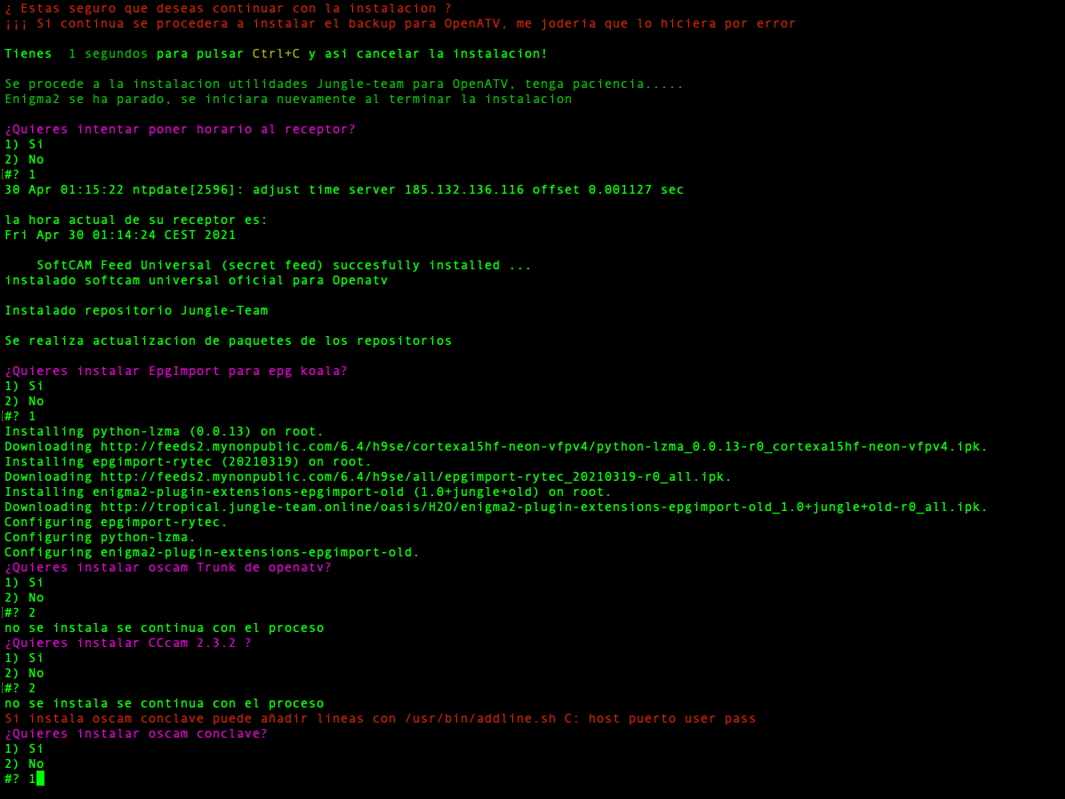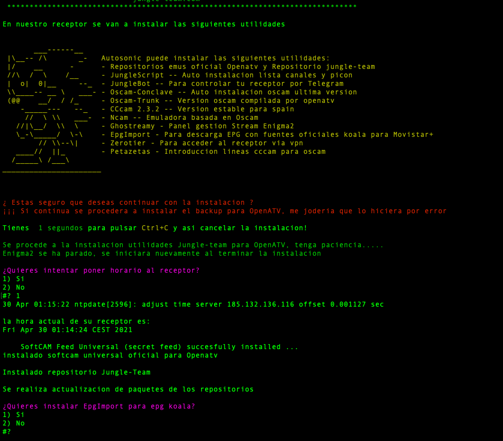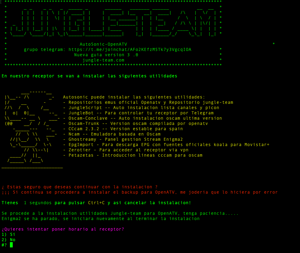 Una vez comience la instalacion de utilidades nos ira solicitando poder seleccionar si deseamos instalar o no por cada uno de los paquetes, comezando si deseamos poner en hora el receptor (sobre todo para instalaciones limpias)