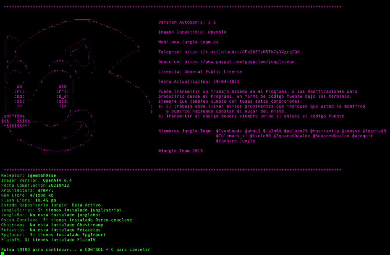AutoSonic 3.0 es un script Shell para imagen enigma2 OpenATV, que facilita lo tedioso o en algunas veces la dificultad que se tiene para configurar OpenATV en una primera instalación, sobre todo cuando no estamos muy habituados a este tipo de sistemas. Puede instalar todas las aplicaciones basicas para un funcionamiento de OpenATV o elegir las que quieres instalar.