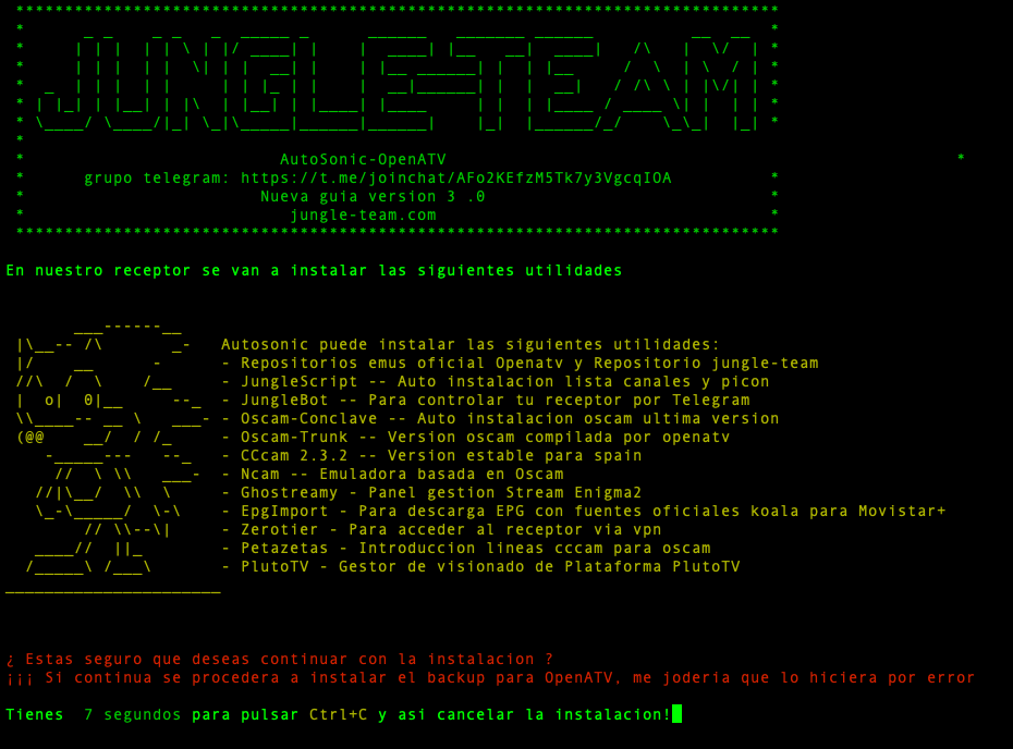 2. Si hemos decidido continuar con la instalacion y pulsado INTRO nos aparecera una segunda interfaz que nos mostrara las utilidades que vamos a poner instalar en nuestra imagen OpenATV, asi como un contador de tiempo de 15 segundos antes que comience la instalacion en si de estas utilidades, podemos cancelar si lo deseamos pulsando nuevamente CONTROL + C