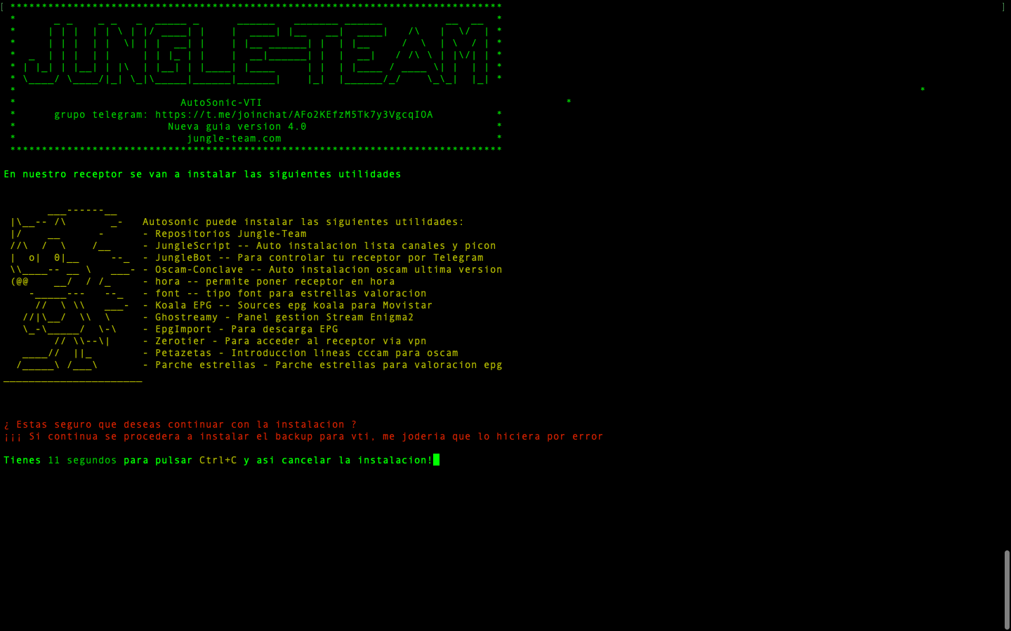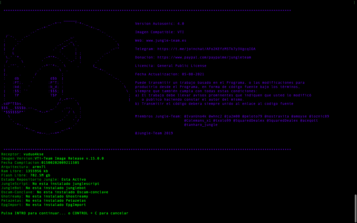 AutoSonic 4.0 es un script Shell para imagen enigma2 VTI para receptores Vuplus, que facilita lo tedioso o en algunas veces la dificultad que se tiene para configurar VTI en una primera instalación, sobre todo cuando no estamos muy habituados a este tipo de sistemas. Puede instalar todas las aplicaciones basicas para un funcionamiento de VTI o elegir las que quieres instalar.