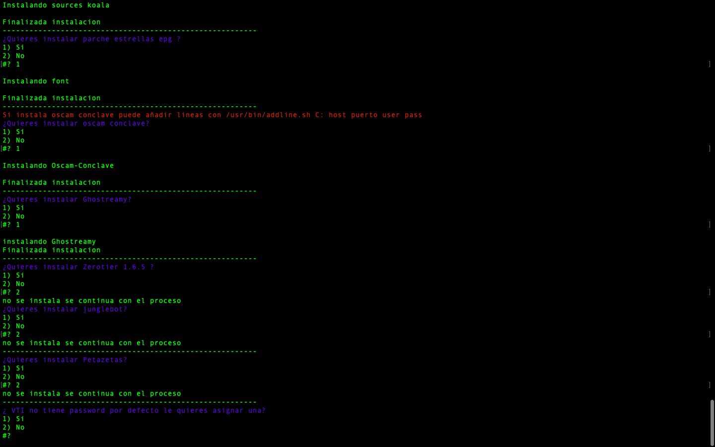 2. Si hemos decidido continuar con la instalacion y pulsado INTRO nos aparecera una segunda interfaz que nos mostrara las utilidades que vamos a poner instalar en nuestra imagen VTI, asi como un contador de tiempo de 15 segundos antes que comience la instalacion en si de estas utilidades, podemos cancelar si lo deseamos pulsando nuevamente CONTROL + C