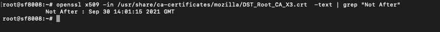 - Ademas de tener esa version de openssl llevan como hemos comentado el archivo DST Root CA X3 caducado que podemos verlo ejecutando el comando