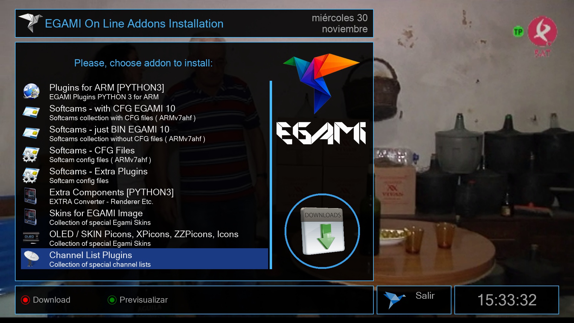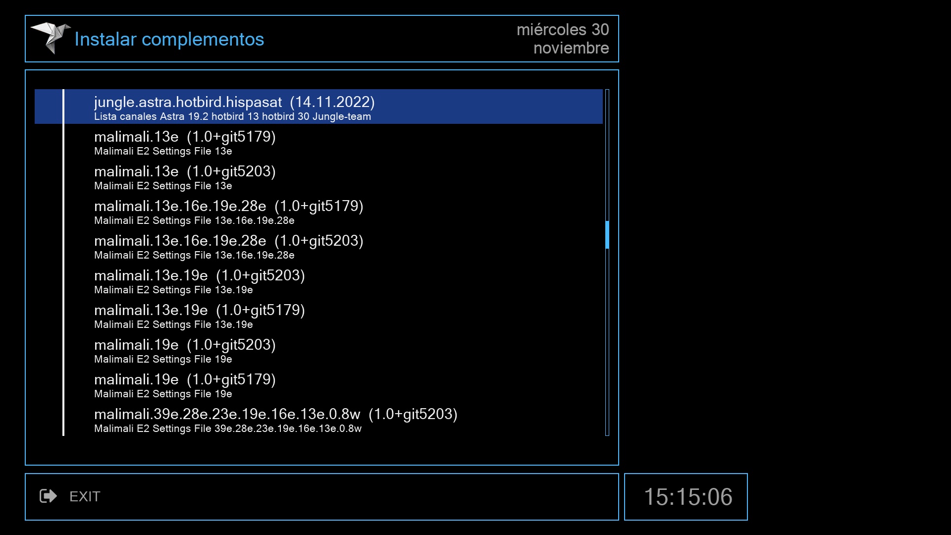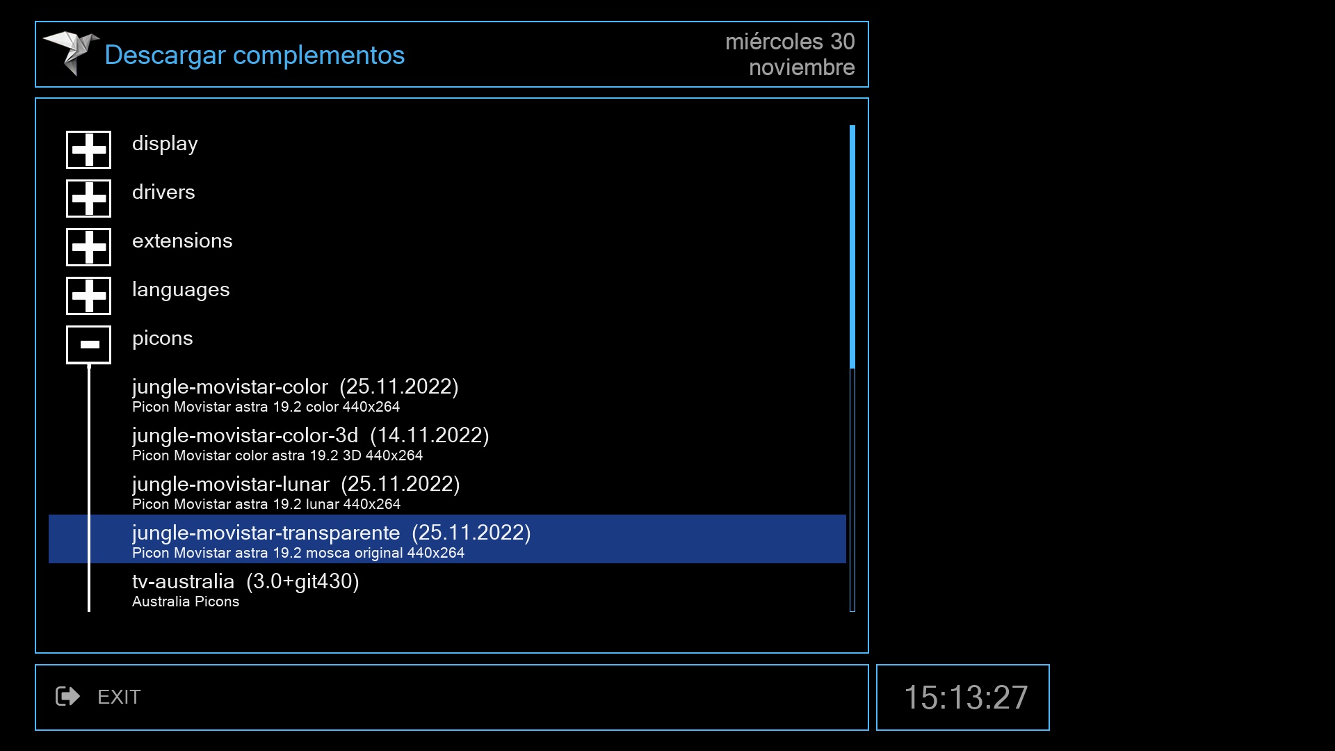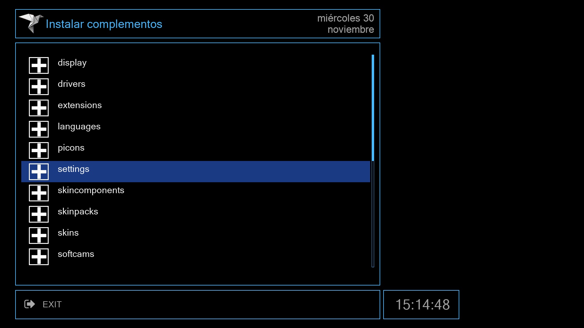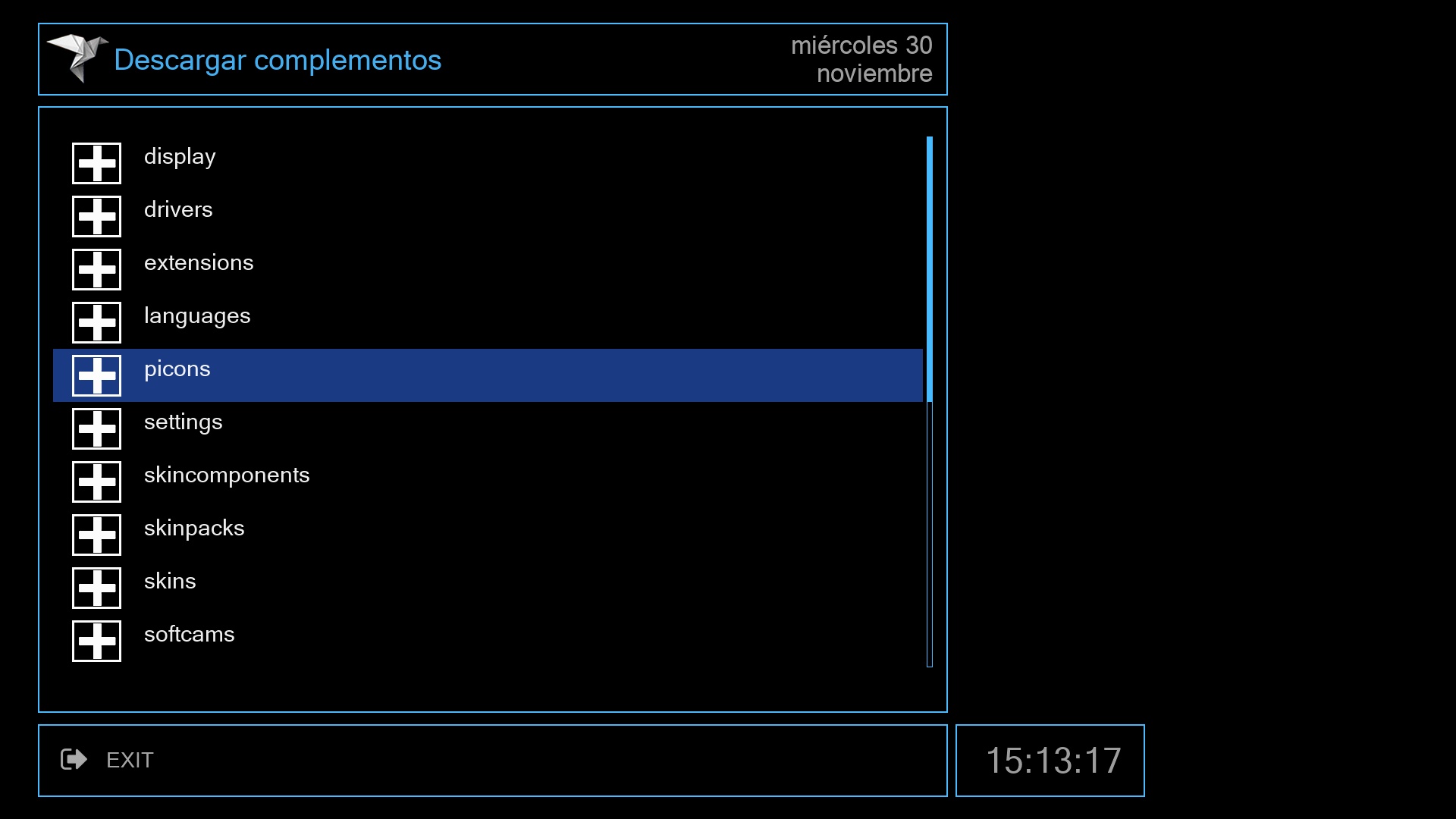 El siguiente paso es instalar una lista canales para nuestros receptores, lo realizamos igualmente desde el menu + complementos