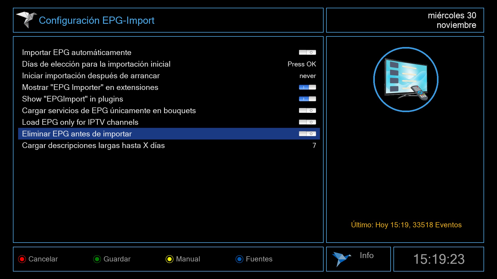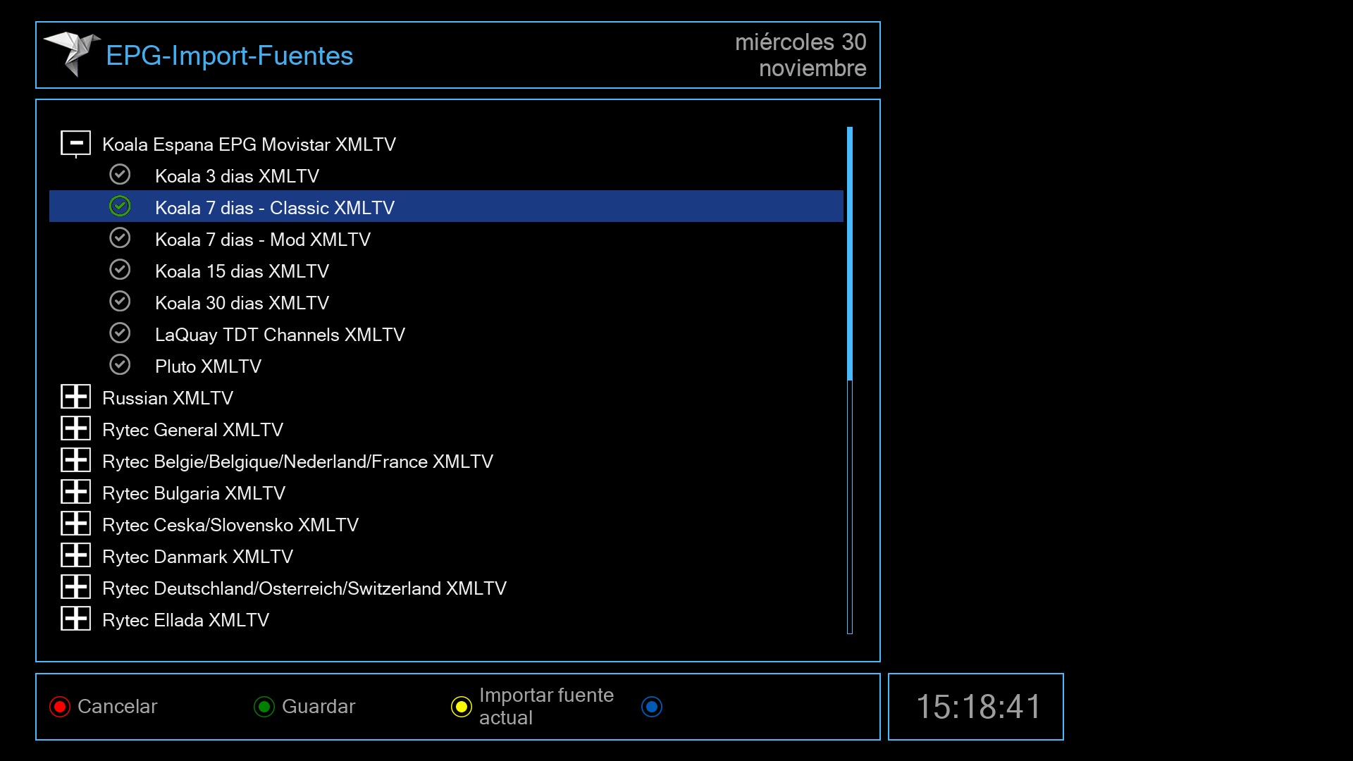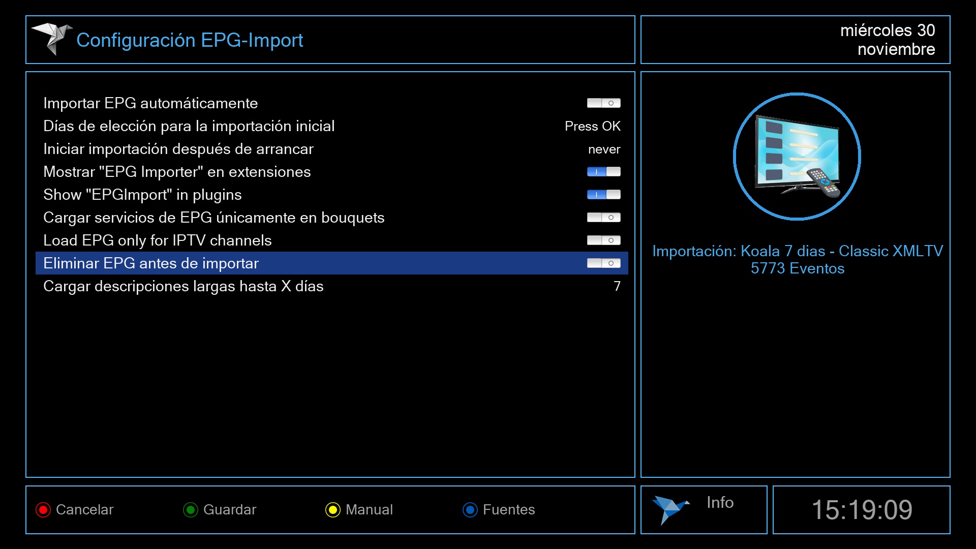 2. Ahora pulsamos boton azul y seleccionamos la fuente de epg, para movistar Koala y los dias de epg que deseamos tener