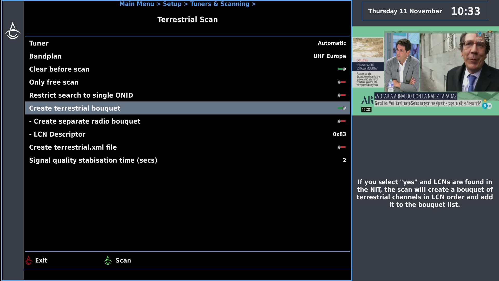 - Create Terrestrial bouquet: Lo activamos de esta manera nos creara automaticamente el favorito con los canales encontrados ya ordenados.