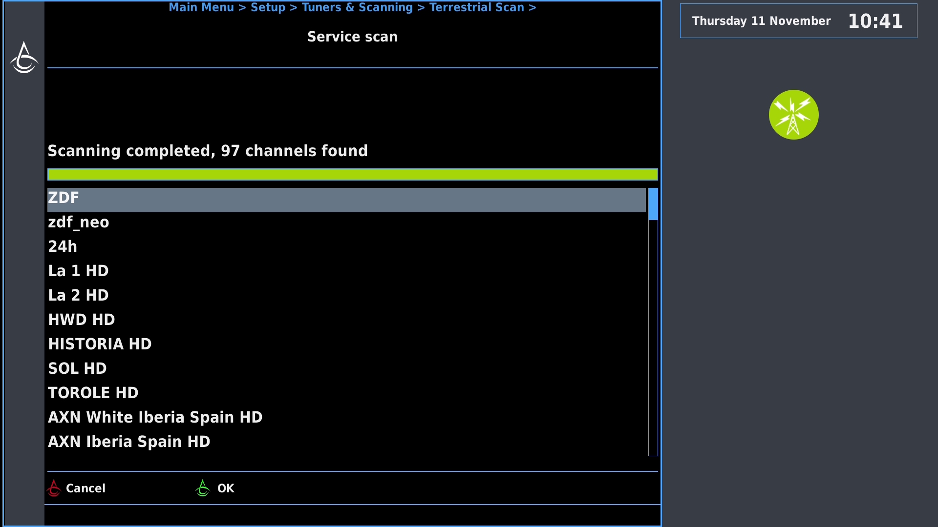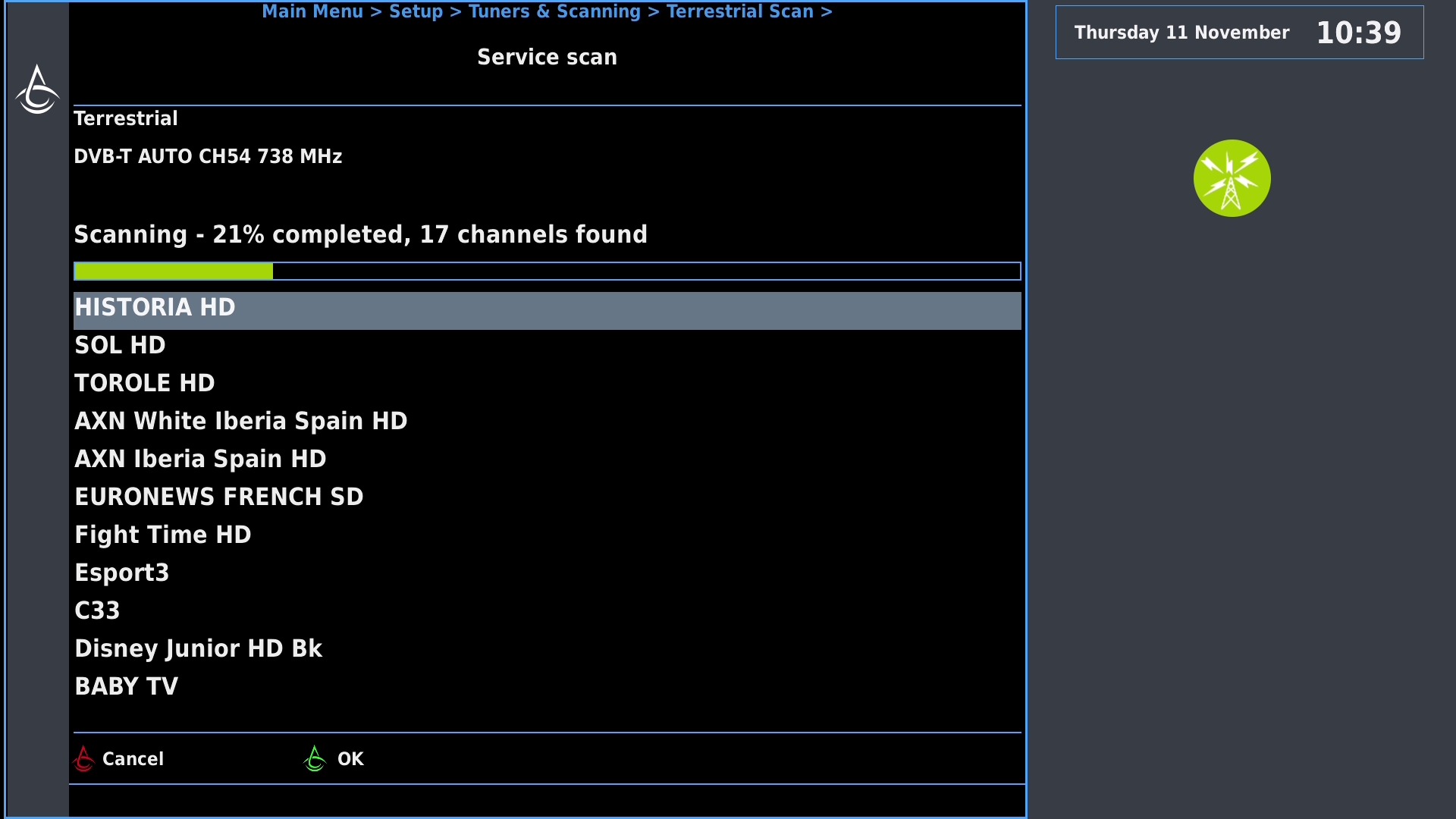 2. Ahora pulsamos boton verde para buscar canales y comenzara la busqueda de canales