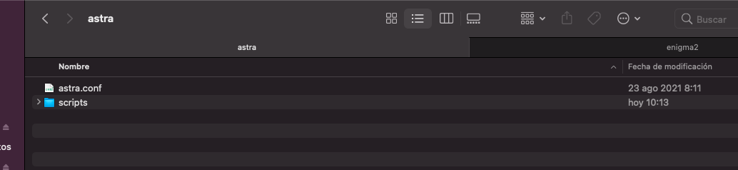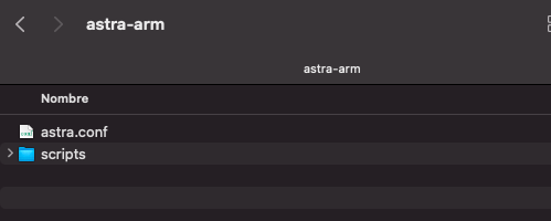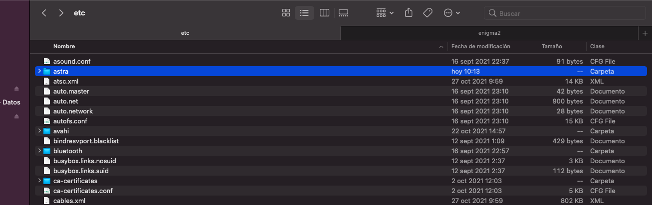 En este ejemplo copiamos los archivos de astra-arm: astra.conf y scrips y los introducimos en la carpeta /etc/astra de nuestro receptor