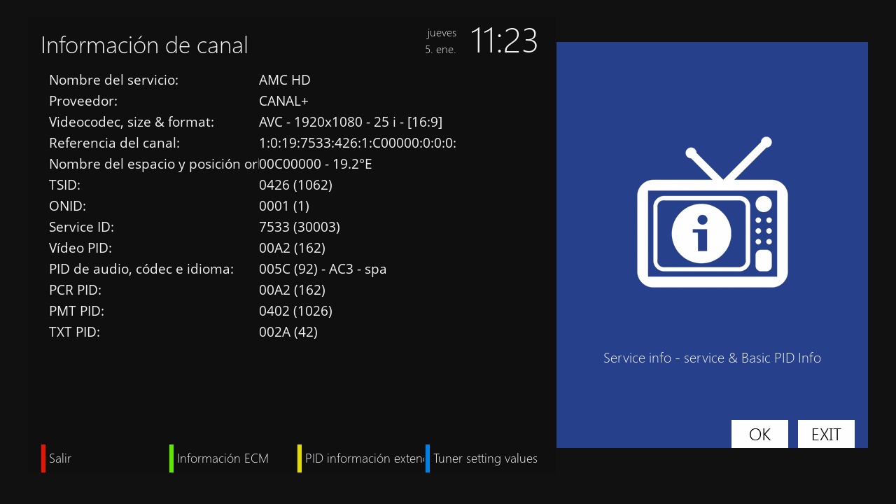 Ahora vamos a ver como calcular el bitrate de los canales individuales de un transport stream, para ello debemos saber el pid de video y audio de flujo de ese canal, una manera muy facil es en el menu informacion canal: