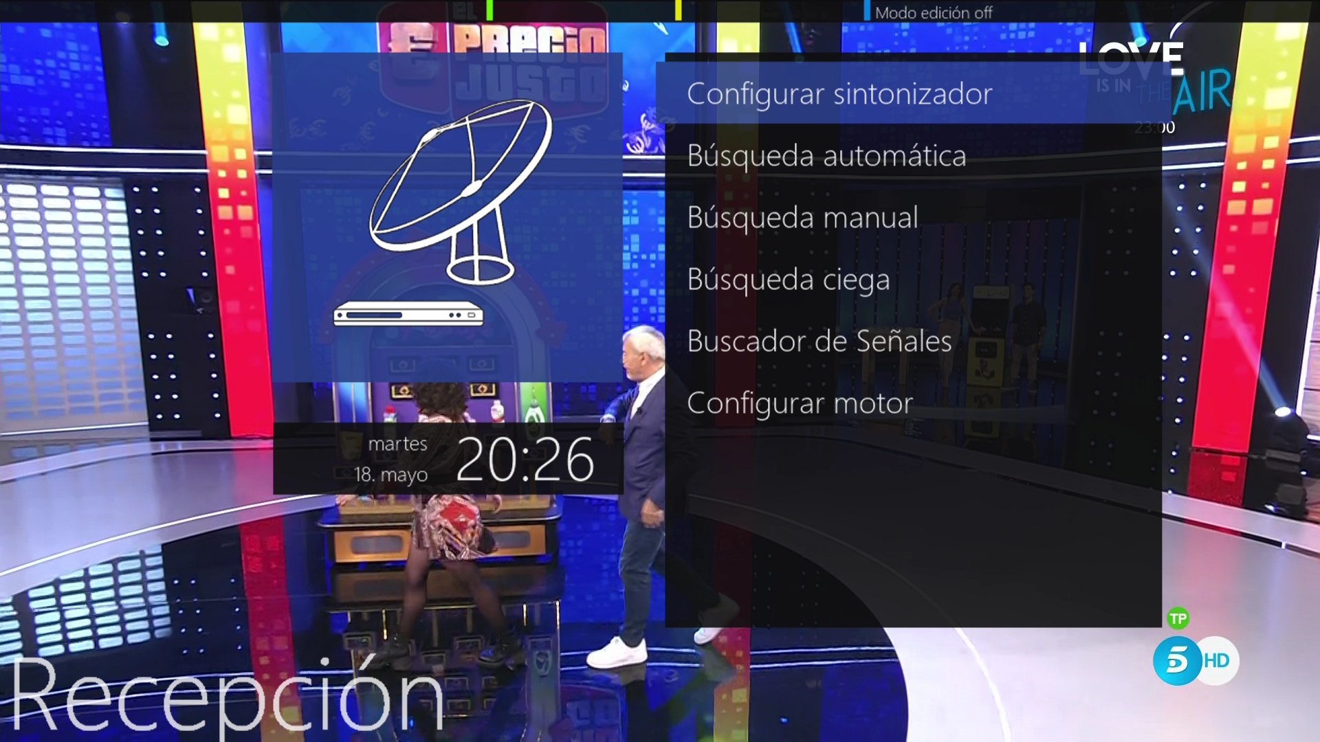 Accedemos al menu de configuracion de tuner situado en menu + configuracion + Recepcion + configuracion sintonizador