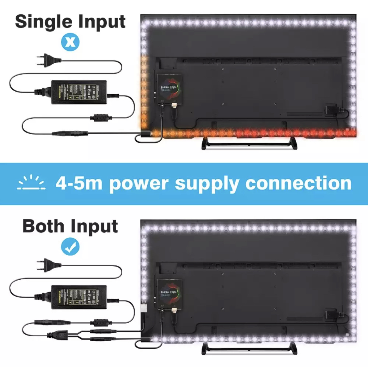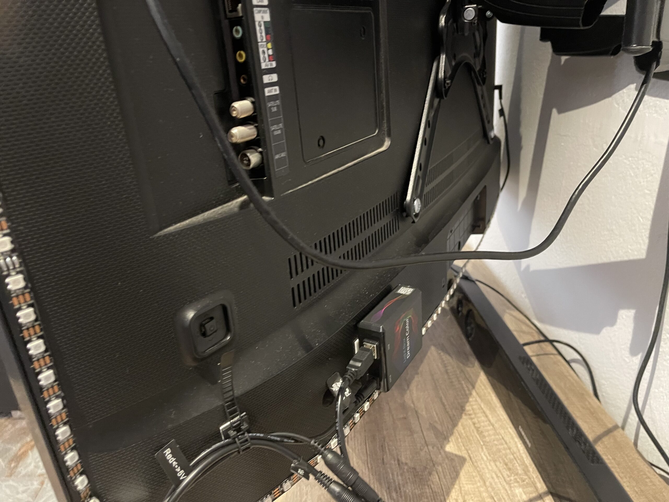 Una vez completadas las 3 esquinas y haber dado la vuelta completa a la tv dependerá de las pulgada tendrá un conector de alimentación o dos , en este caso son dos ya que la tira es de 4 metros teniendo que alimentar por las dos puntas, quedando según el esquema, según vemos en la caja de conexiones dream color, tenemos una entrada de datos y otra de alimentación , el cable de datos lo insertamos en el puerto usb de nuestro decodificador enigma2.