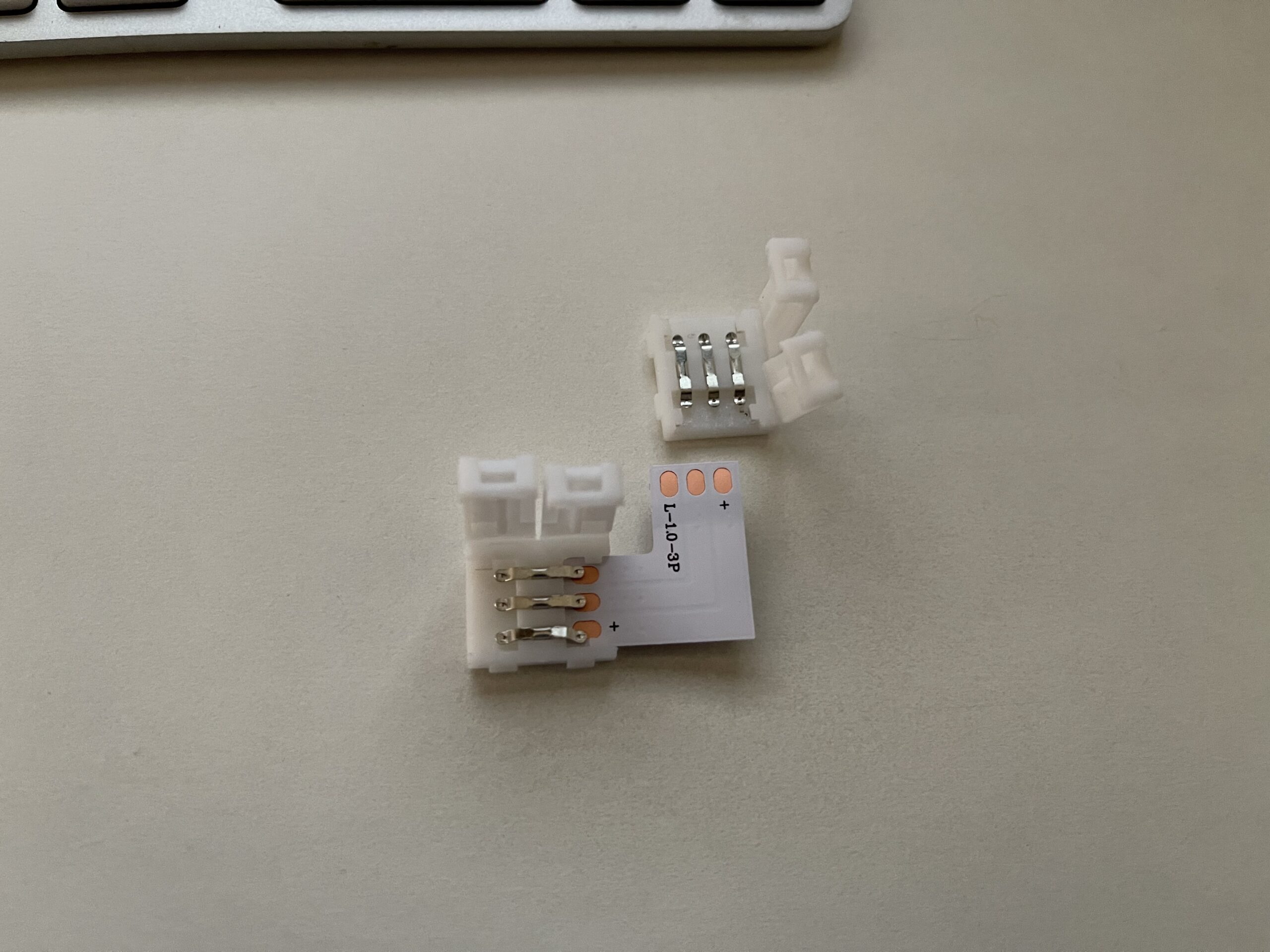 Ahora cogemos el conector L y siempre respetando la polaridad lo introducimos por cada una de sus laterales quedando conectado por los dos extremos.