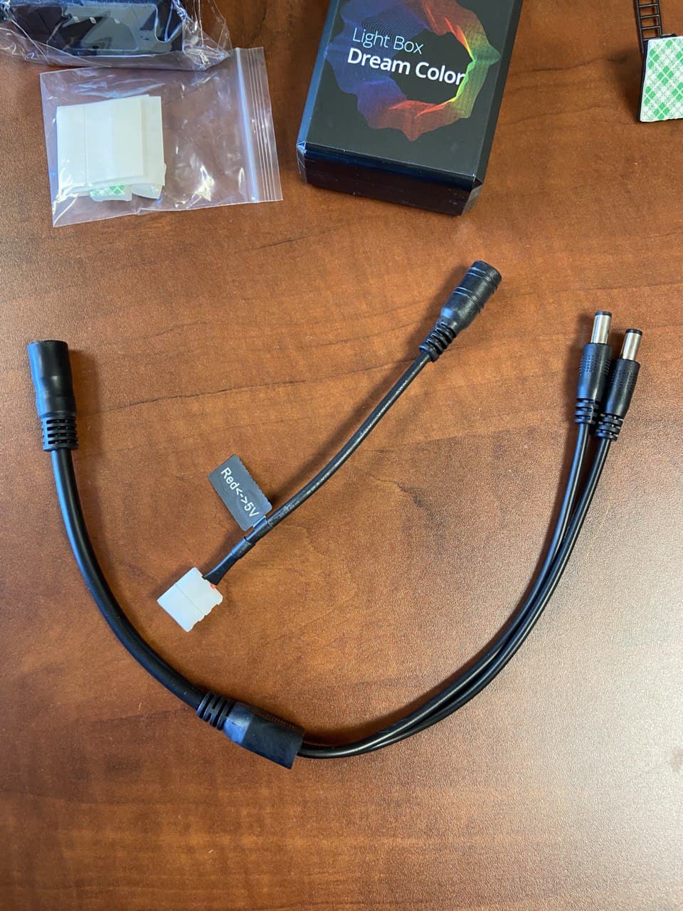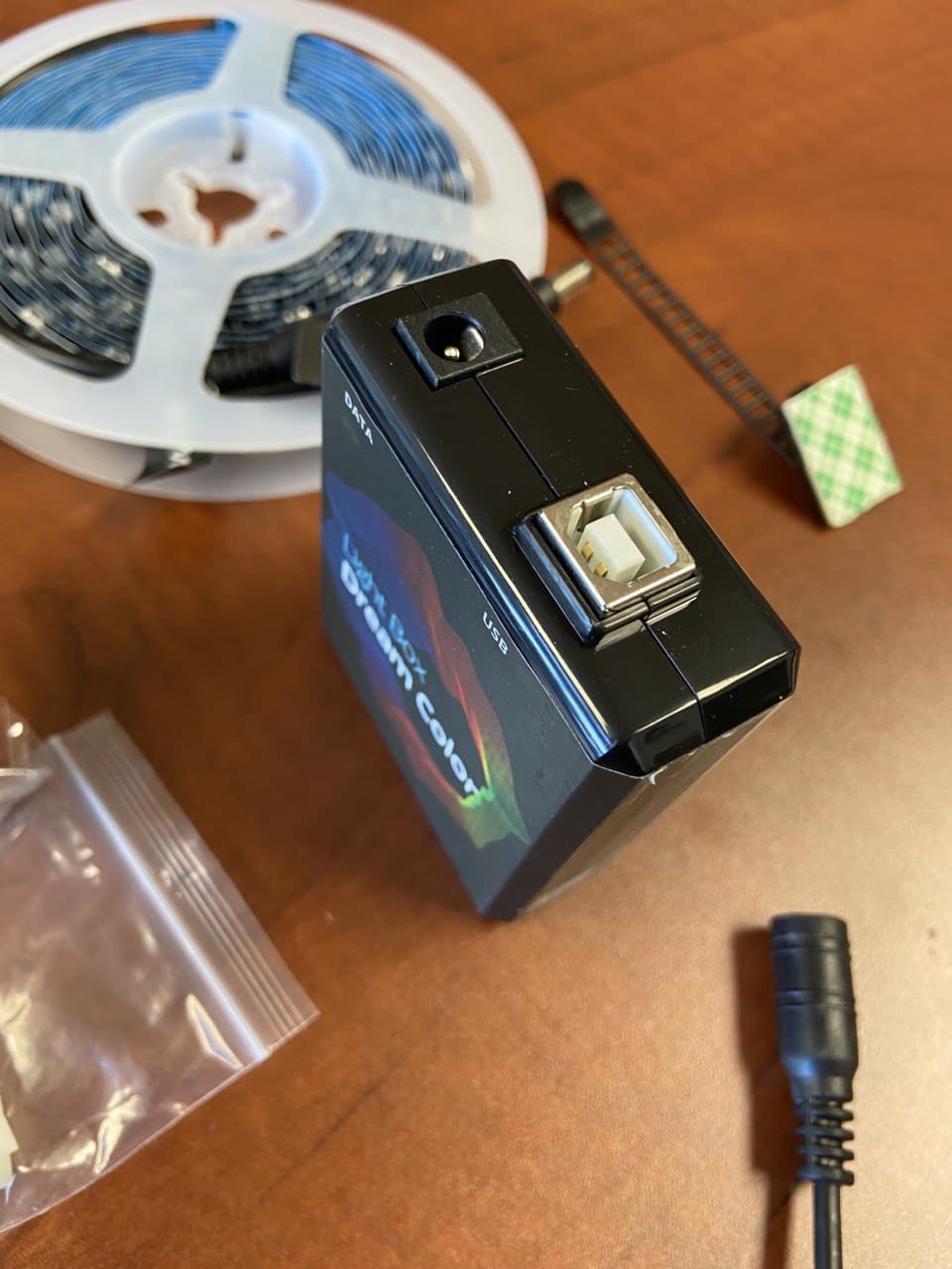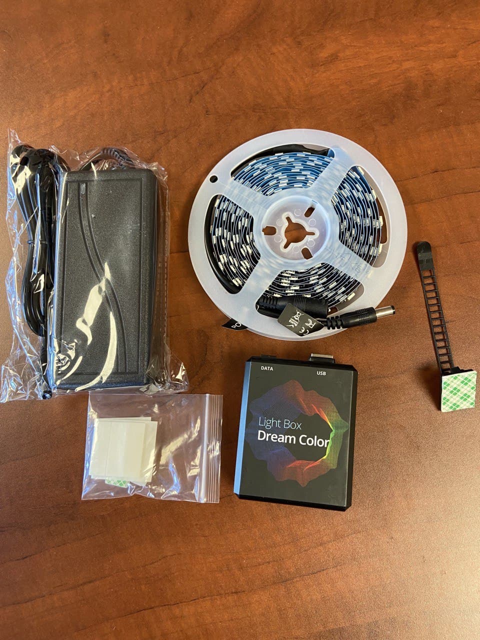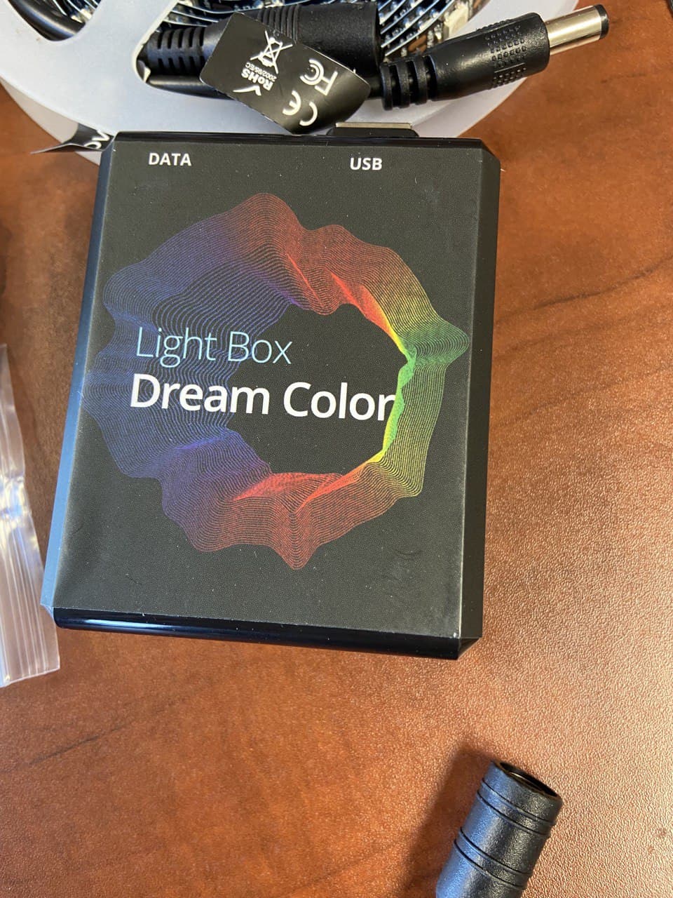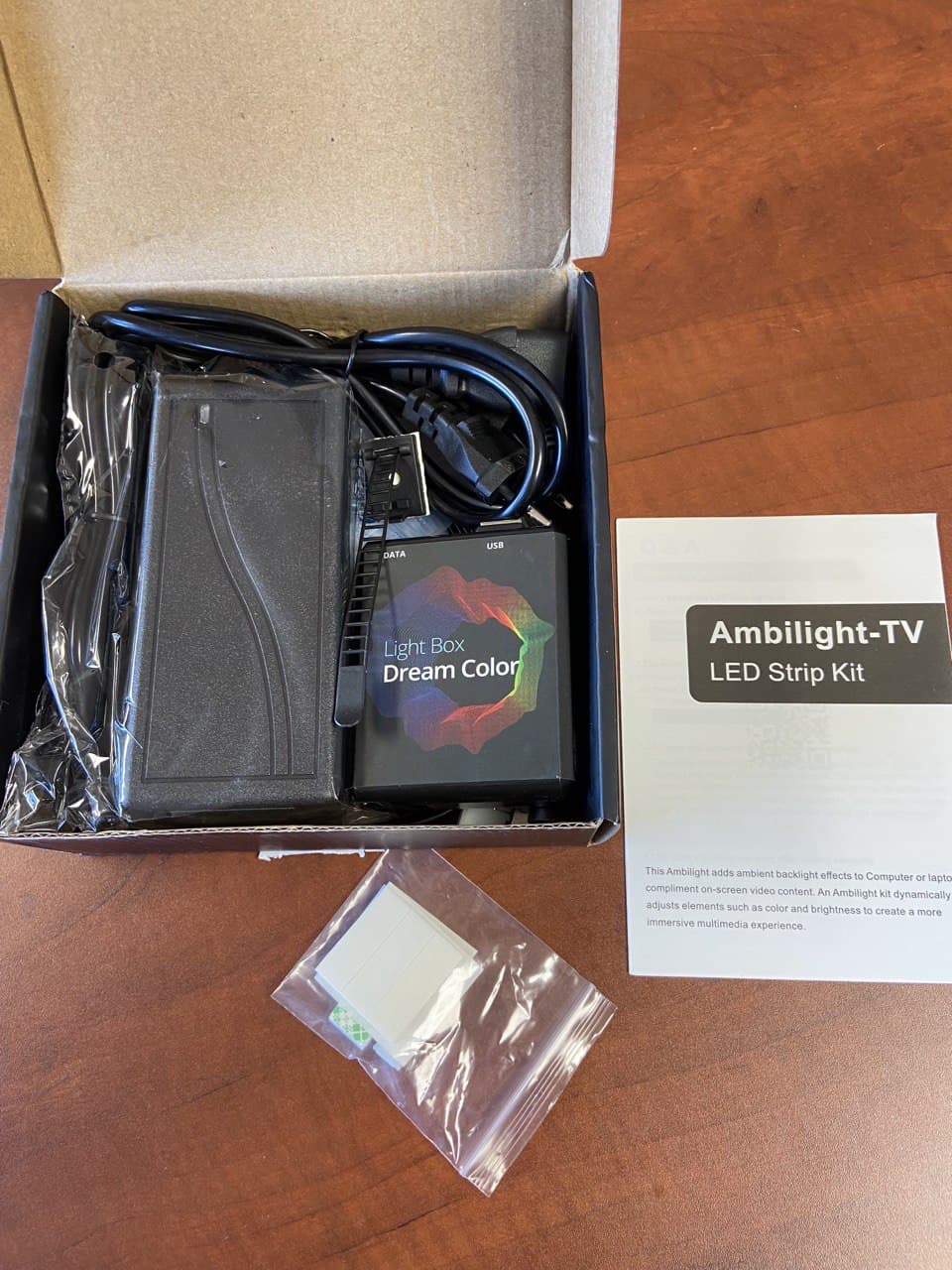 Todo el pack light Box viene en una caja de cartón de color negro serigrafiado en nuestro caso como hemos comentado 4 metros de 60 led. una tira de velcro adhesiva, una fuente de alimentación, una pequeña caja negra con un cable que se conecta por un lado a la tira led y por otro al receptor enigma2.