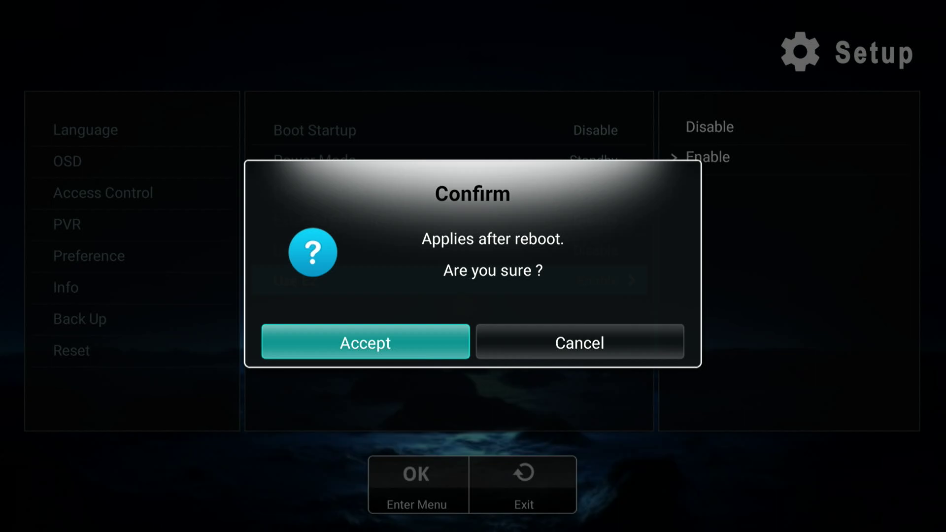 Nos solicitara reiniciar el receptor pulsamos en aceptar y dejamos que el mismo se reinicie y arranque de nuevo en Android-TV