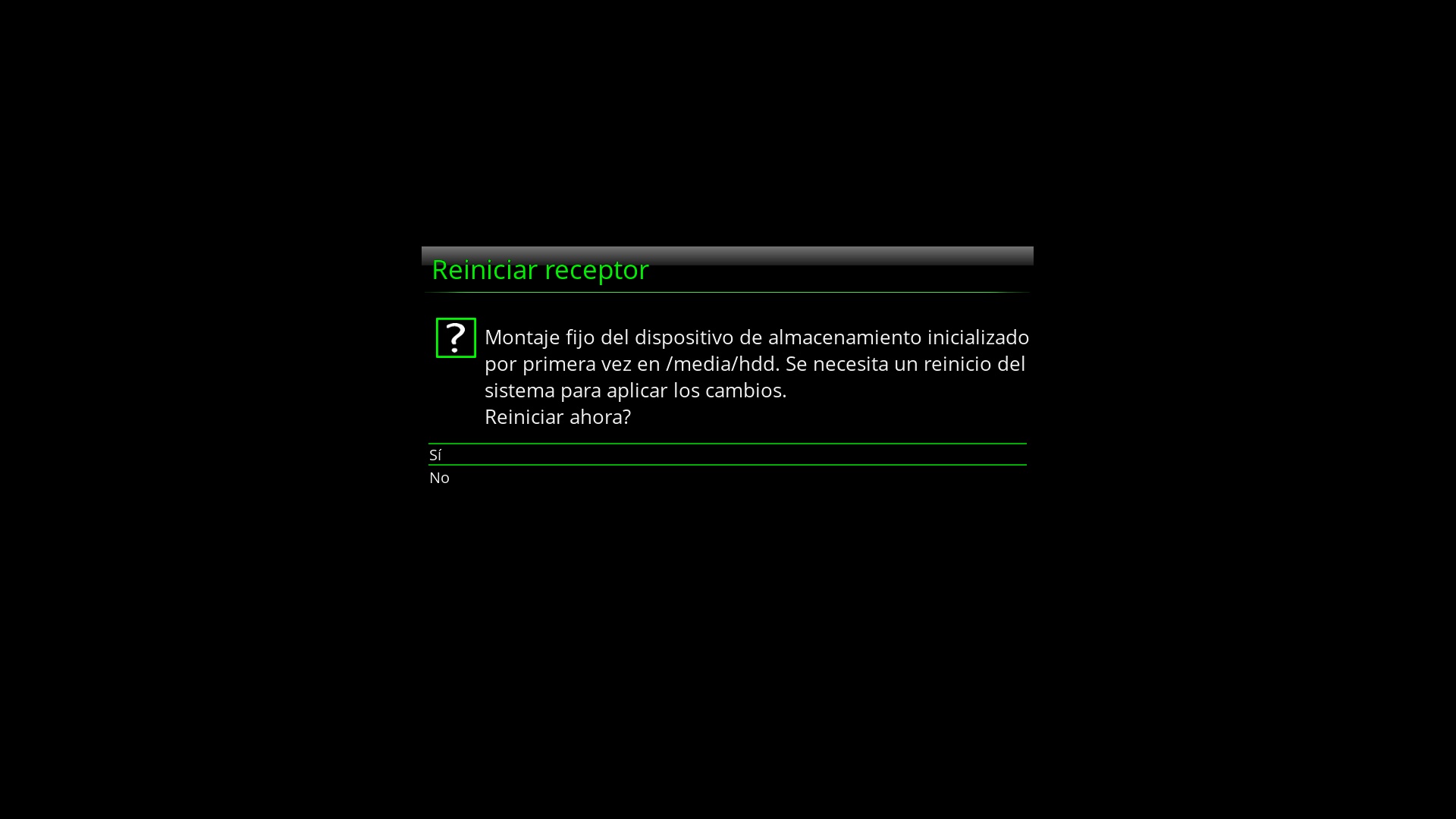 Una vez finalizado el formateo, nos solicitara automaticamente si deseamos montar el dispositivo como media/hdd en el caso que queramos ese punto de montaje pulsaremos en si y el receptor se reiniciara quedando ya nuestro dispositivo montado como /media/hdd.