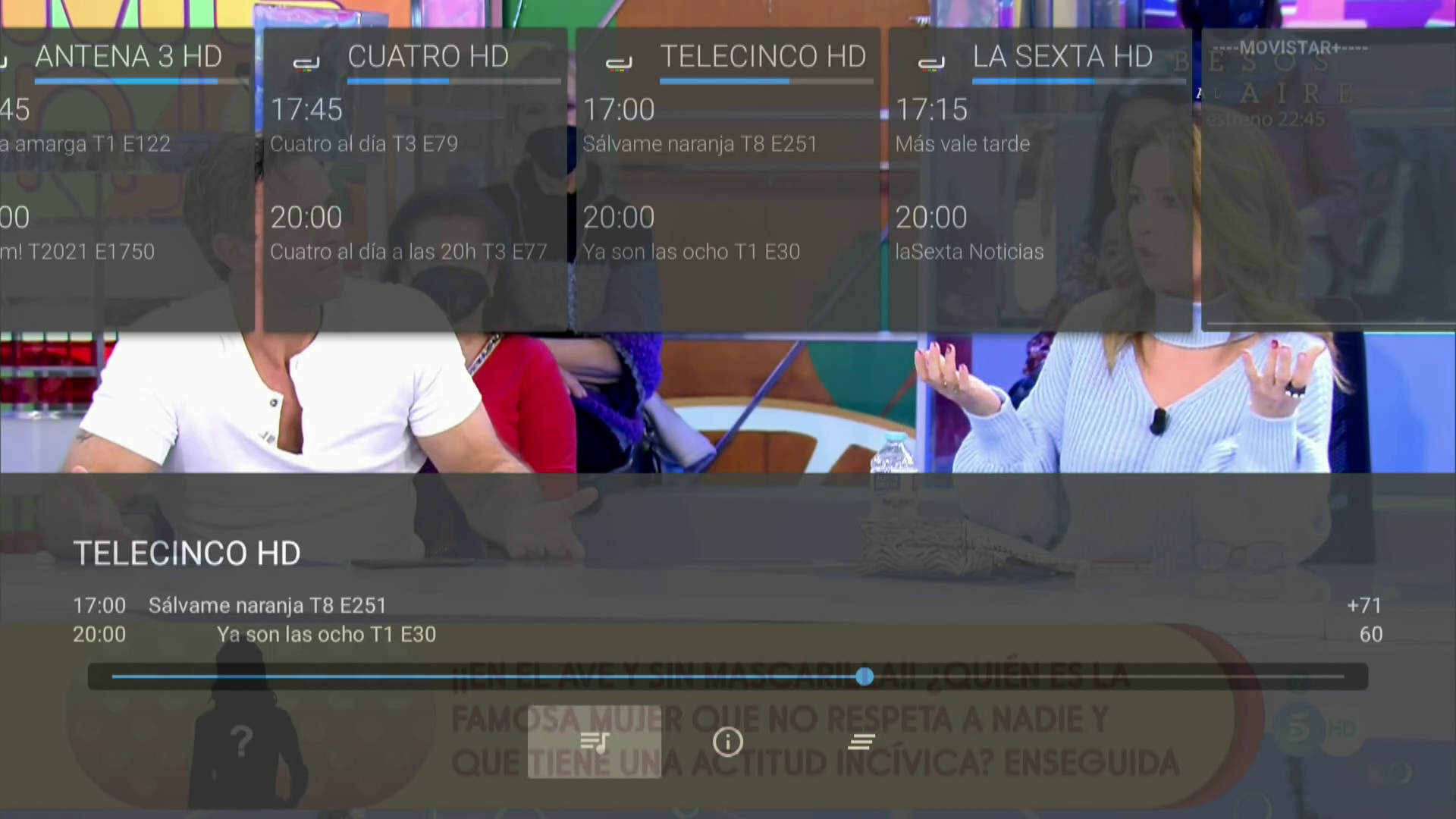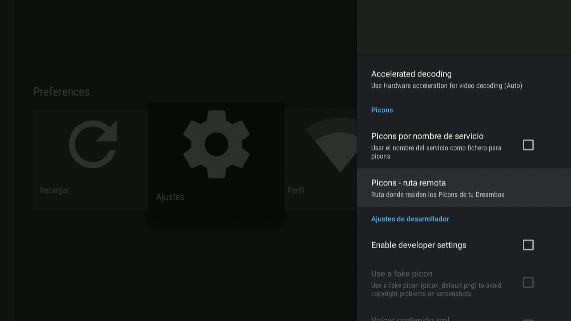 3. Una vez accedemos a la app en primer lugar le podemos dar a Ajustes para el caso que deseemos mostrar los picones del deco en la lista canales de la app