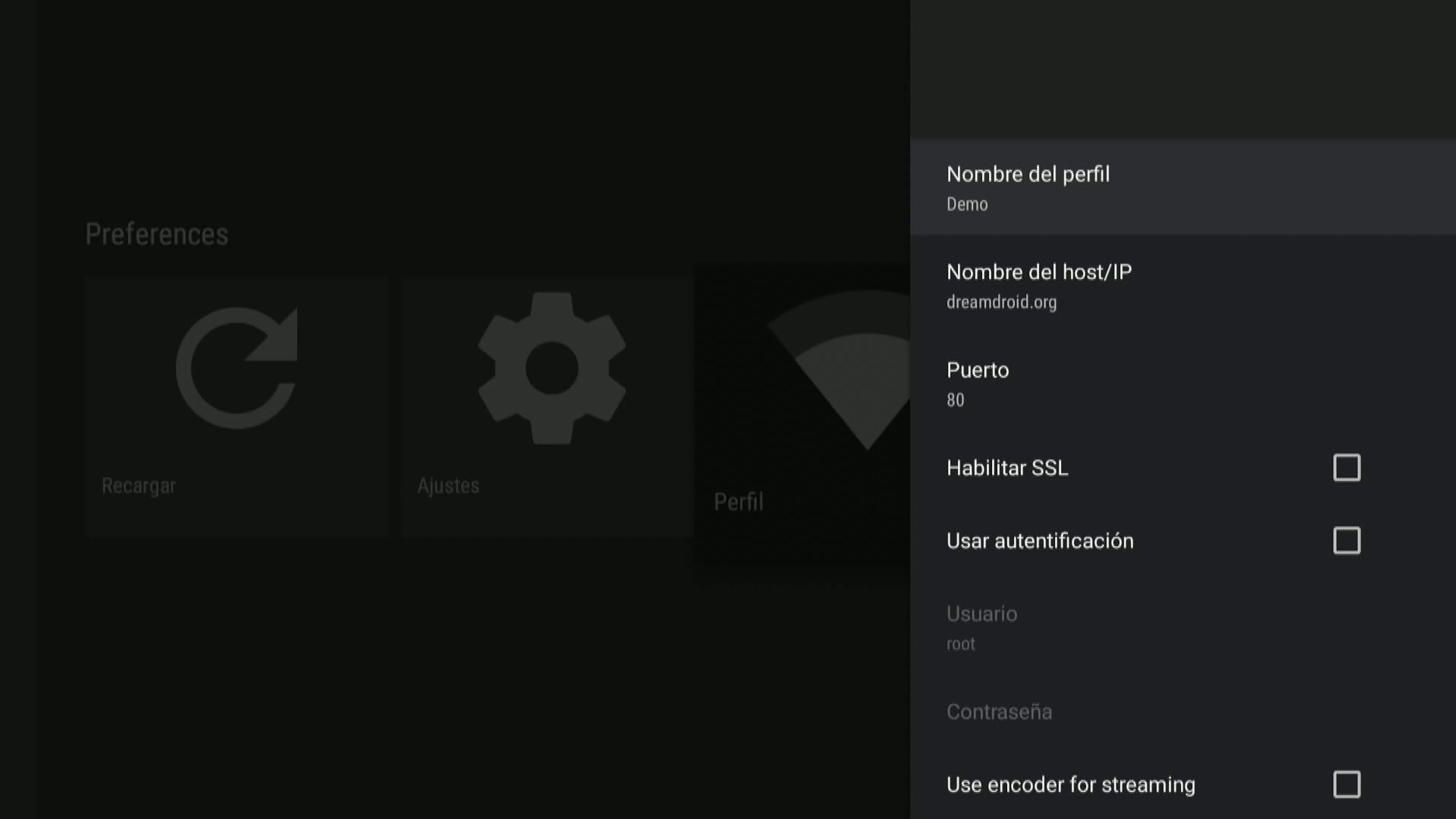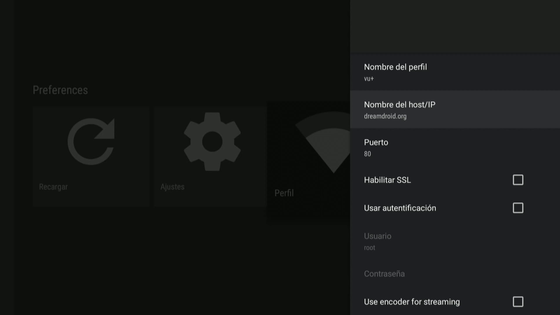 5. Ahora pulsamos en perfil para poner los datos de acceso al receptor
