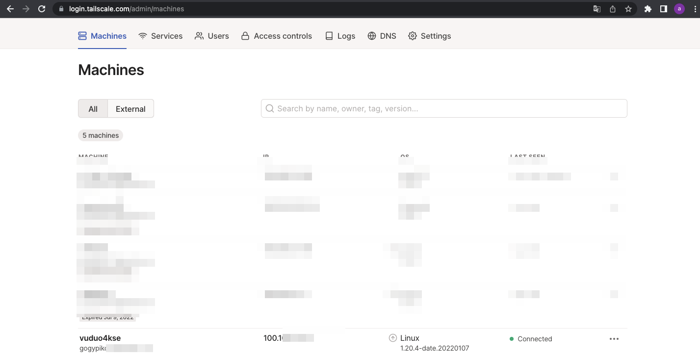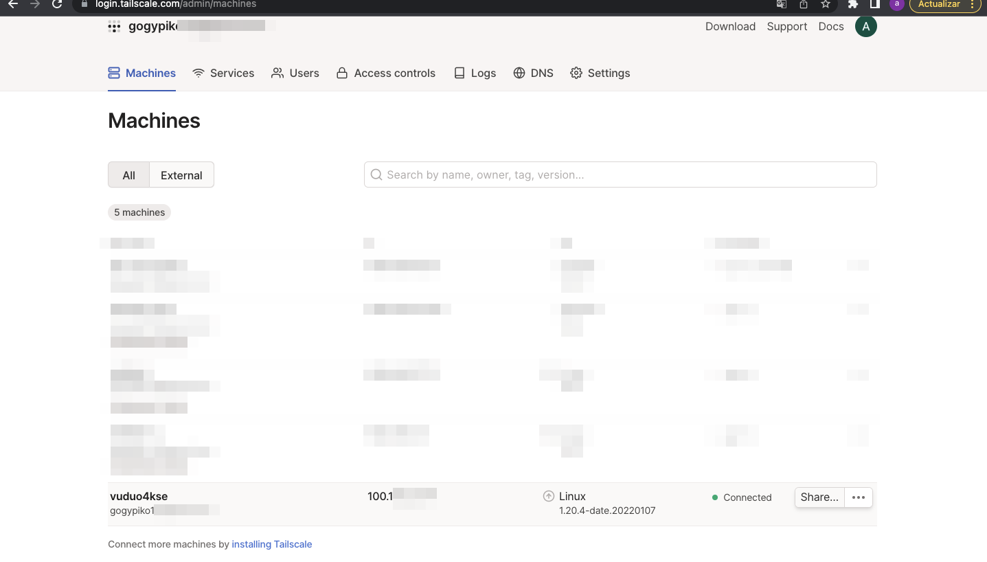 Observando como el receptor que hemos añadido ya nos aparece en machines en tailscale