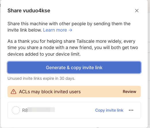 b) pulsamos luego sobre copy invite link, y ese link se lo damos a la otra cuenta tailscale que deseamos que se conecte como invitado a nuestro receptor.