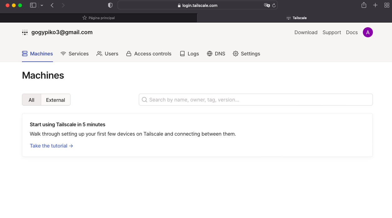 Pulsando sobre nuestra cuenta de correo nos aparecera la gestion de tailscale, en un primer momento sin machines hasta que realizemos la instalacion de tailscale en nuestro receptor enigma2 y realizemos la autorizacion.
