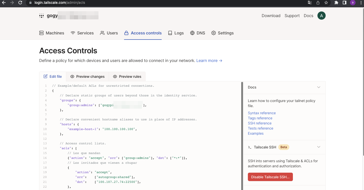 1. Pulsamos sobre Acces Control en tailscale y observaremos que podemos establecer reglas