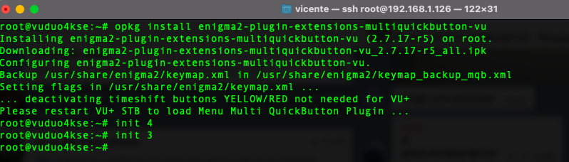 Accedemos a traves de terminal al receptor con imagen VTI y ejecutamos los siguientes comandos para realizar la instalacion de multiquickbutton-vu