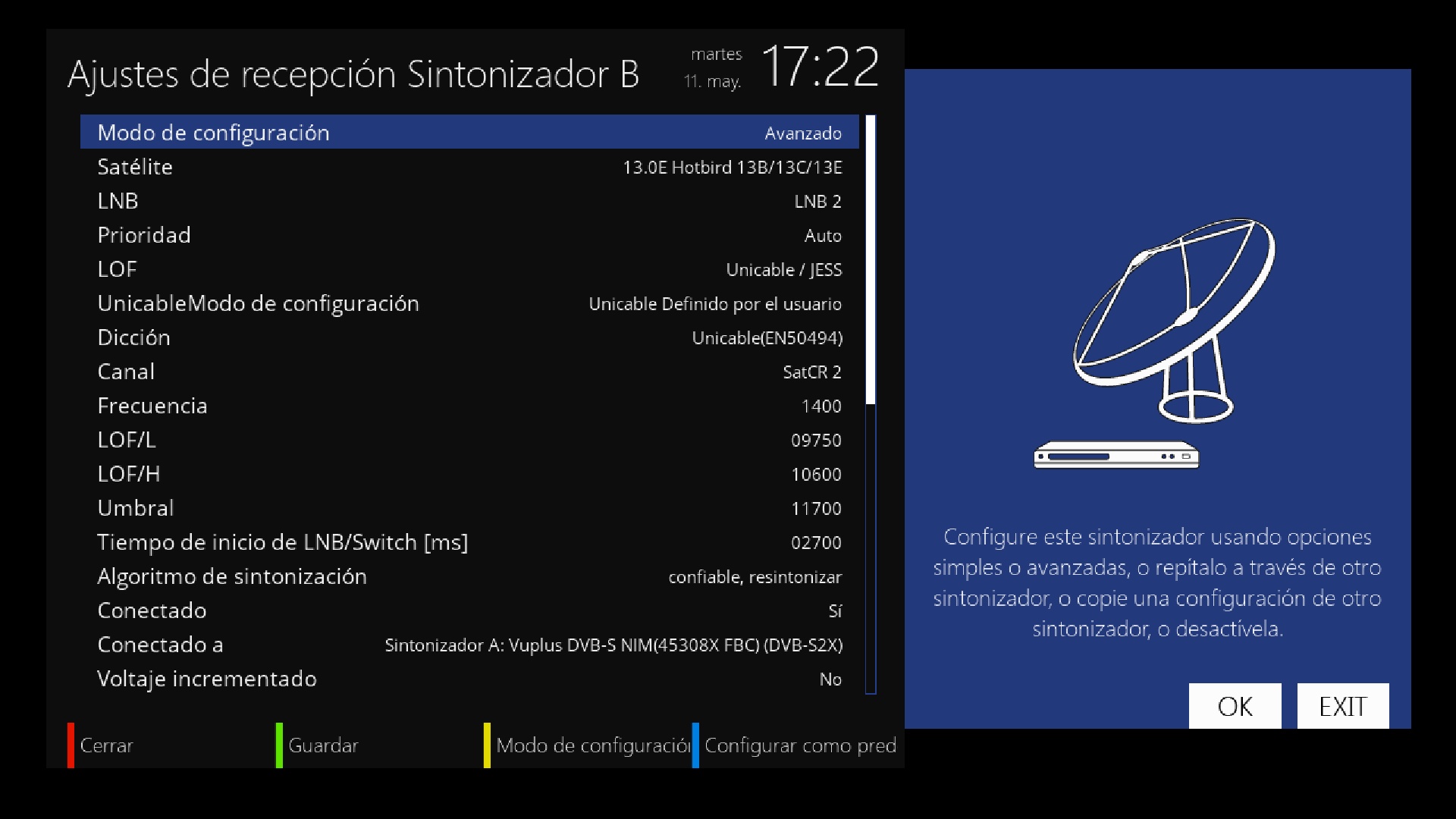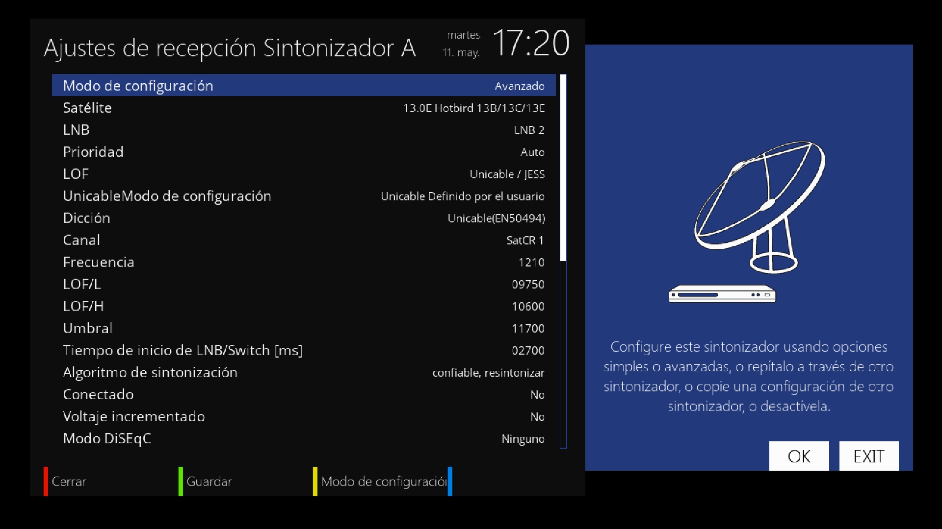 - Unicable modo configuration: Unicable Definido por el usuario (Ya que no deja seleccionar dos veces el mismo unicable)