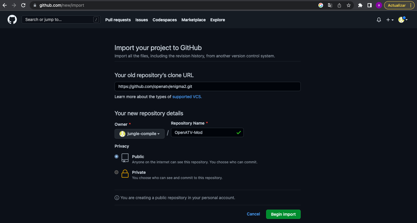 4. Ahora en clone url introducimos la url de openatv y en nombre de repositorio introducimos el nombre que deseamos llamar a nuestro repositorio