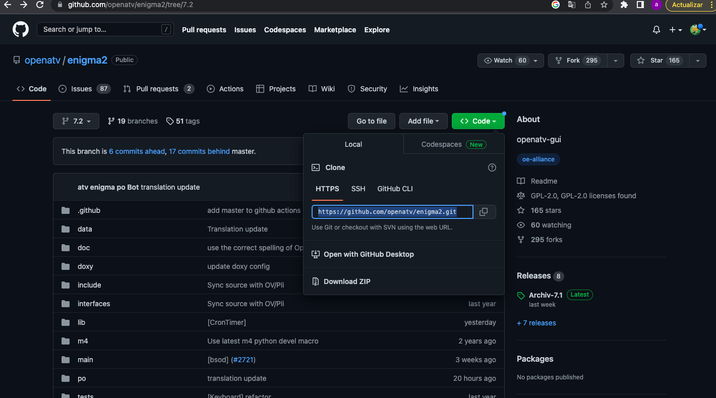 2. En este ejemplo accedemos a codigo github de openatv para copiar la url
