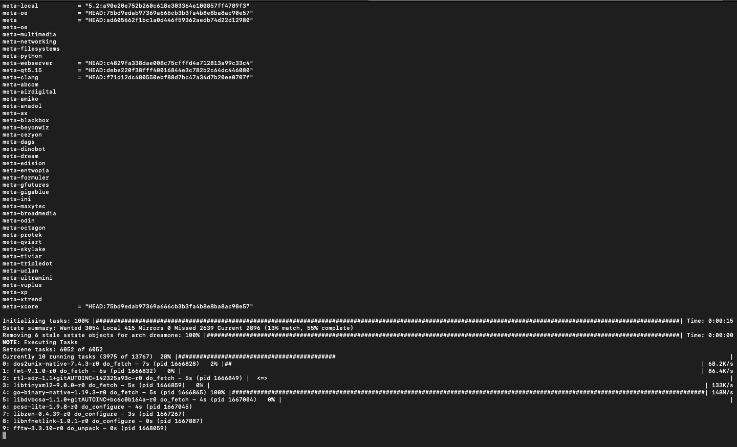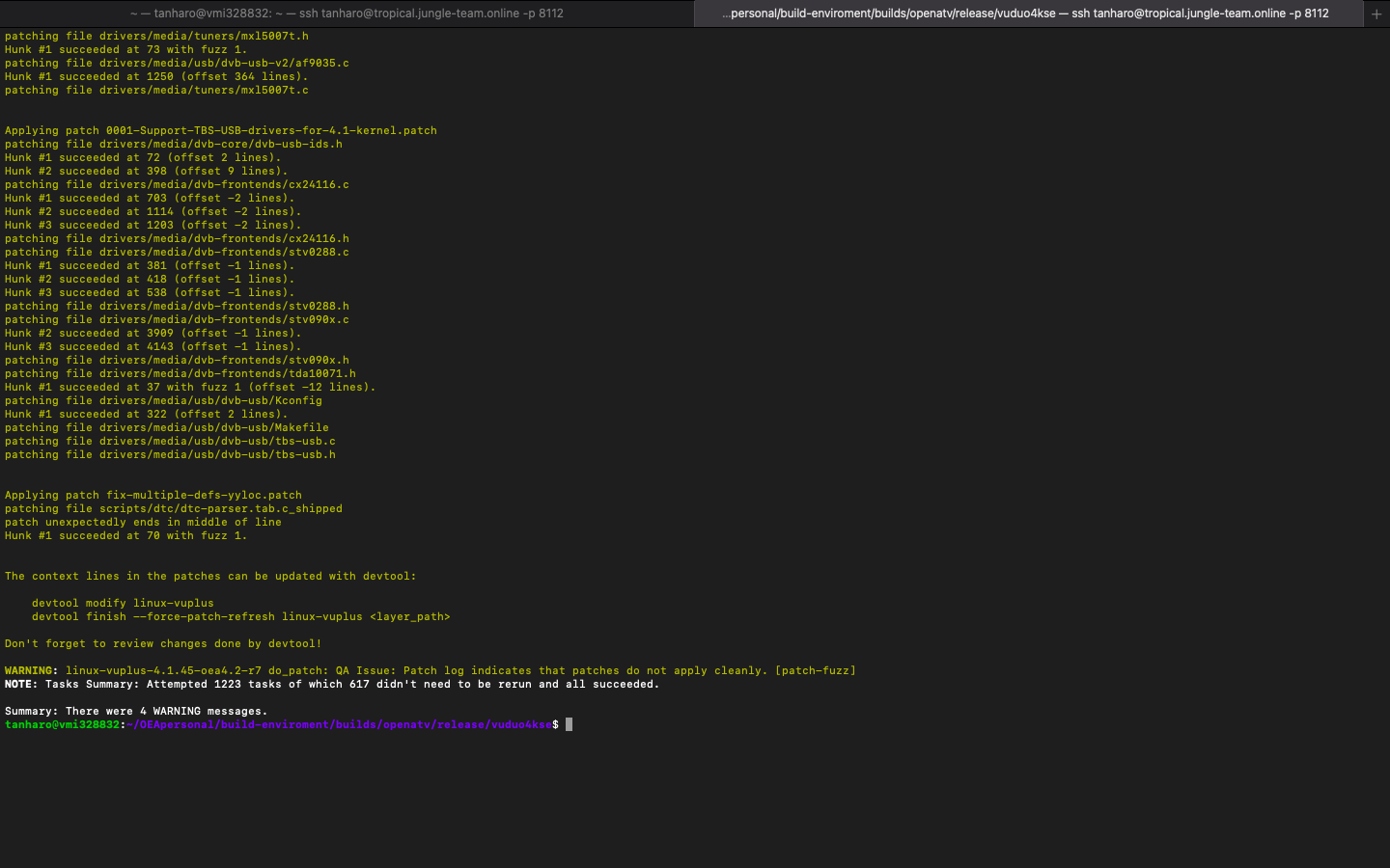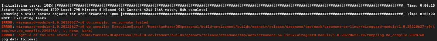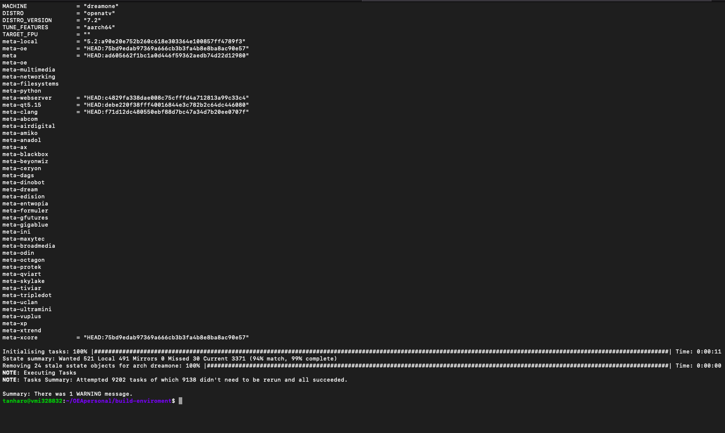 Durante la compilacion pueden observarse errores marcados en rojo, si no son esenciales la compilación continuara, y finalizara, siendo el directorio donde encontraremos la image compilada en este ejemplo en build-enviroment/builds/openatv/release/dreamone/tmp/deploy/images/dreamone