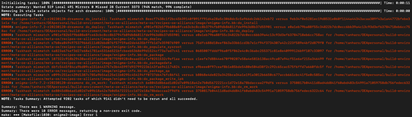Un error comun que suele aparecer es que el sistema de compilación OpenEmbedded usa sumas de verificación y caché de estado compartido para evitar cambios innecesarios, que puede producir error de hash,aunque la compilacion se realizara correctamente