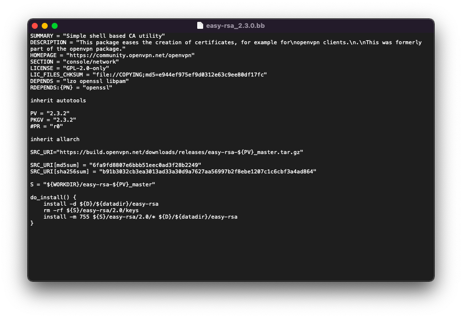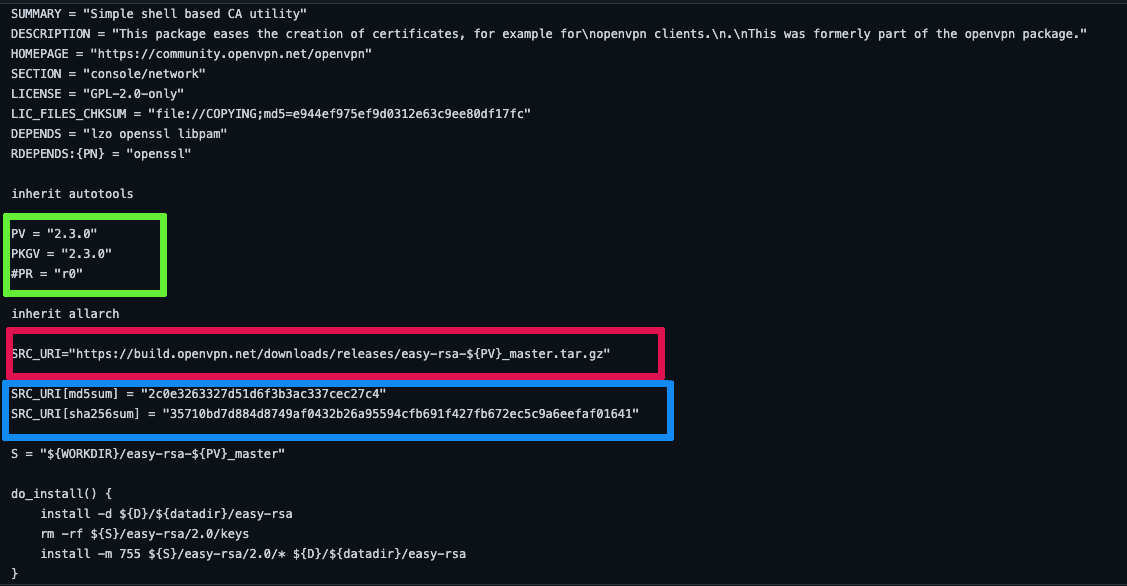 En este caso la version del paquete easy-rsa que se compila es la version 2.3.0, ahora vamos a ver como modificar la receta para compilar con una version superior, por lo tanto abrimos esta receta, y observamos lo marcado en colores: