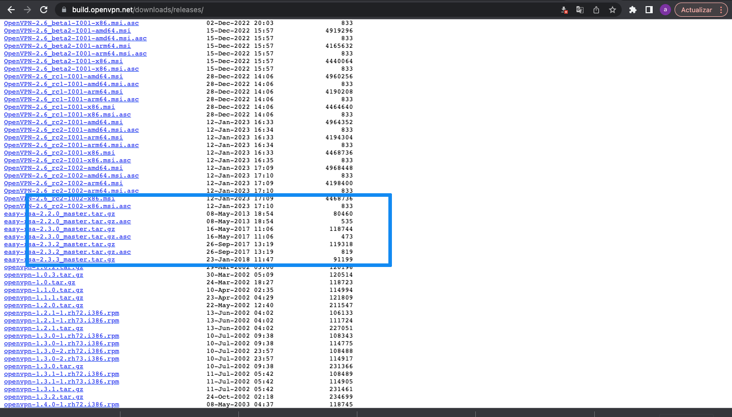 - Marcado rojo: url donde se hallan los sources de easy-rsa, por lo tanto accedemos a la url y vemos la versiones disponibles