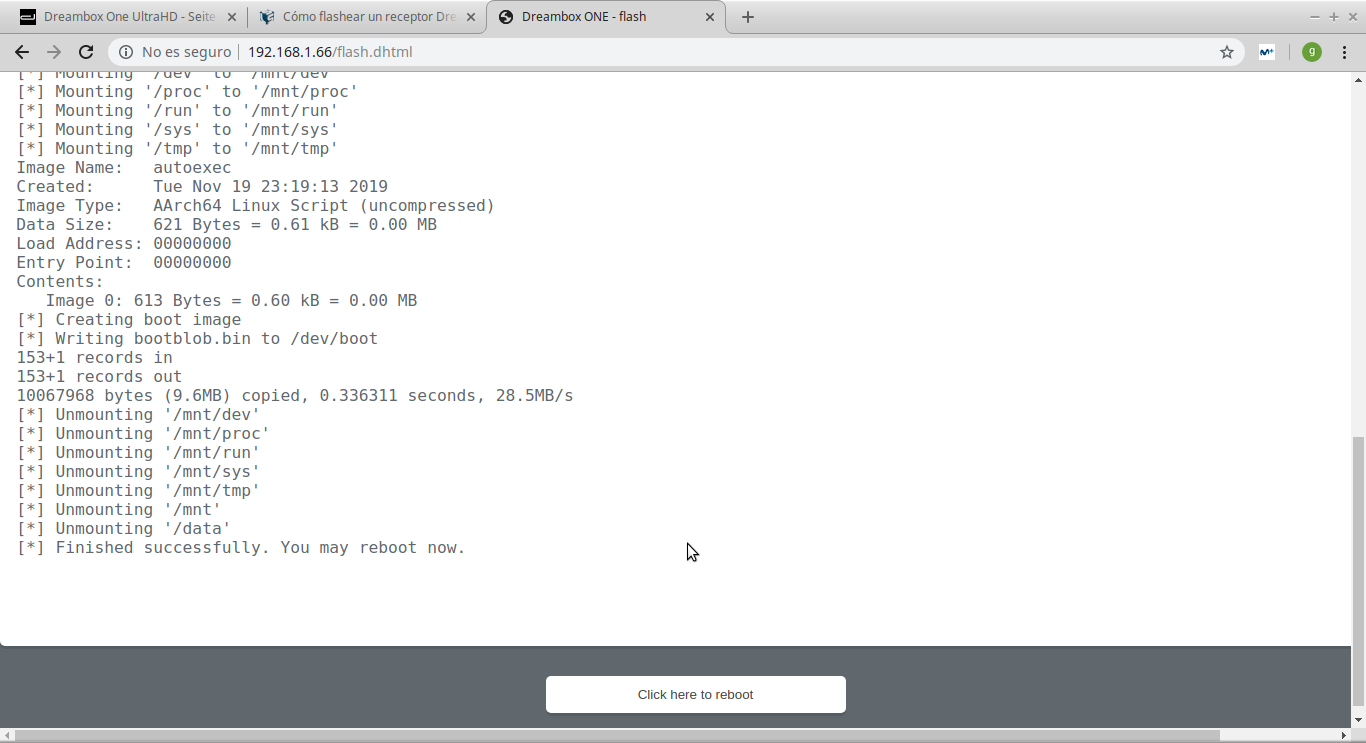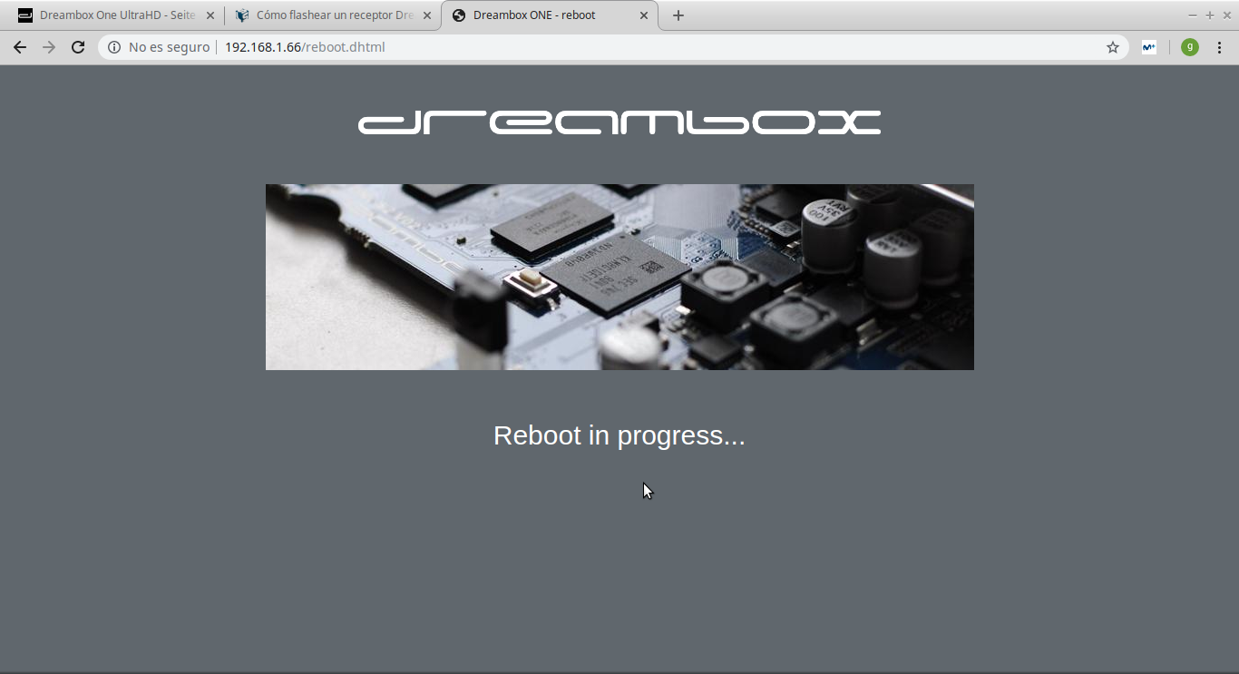 Una vez finalizada la instalacion de la imagen el receptor observaremos que queda como muestra la imagen y pulsamos en reboot y ya tendremos nuestro receptor actualizado a la imagen elegida.