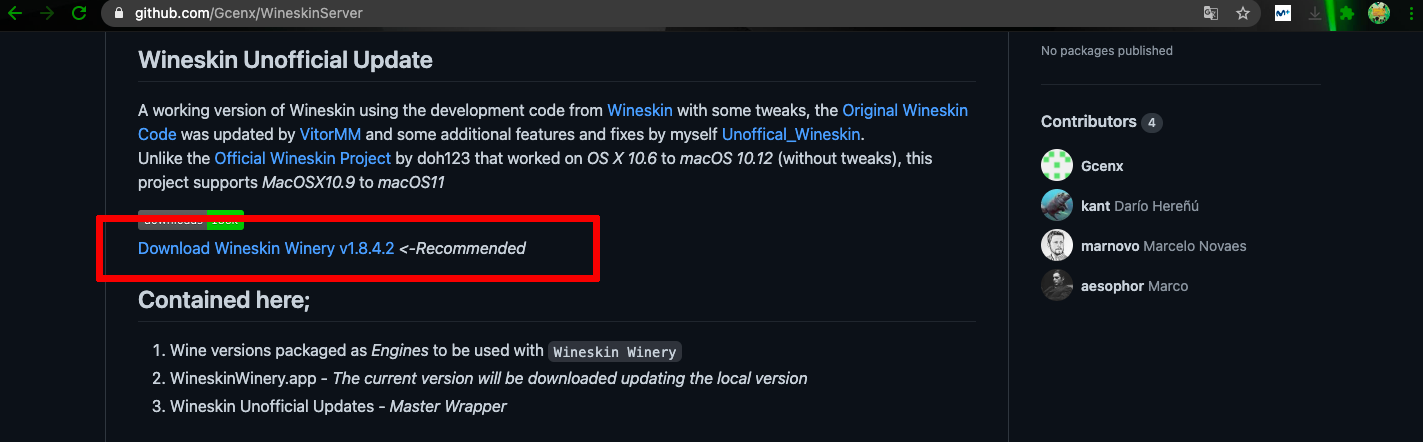 Accedemos a la siguiente url: https://github.com/Gcenx/WineskinServer y a continuacion pulsamos sobre la opcion de descarga.