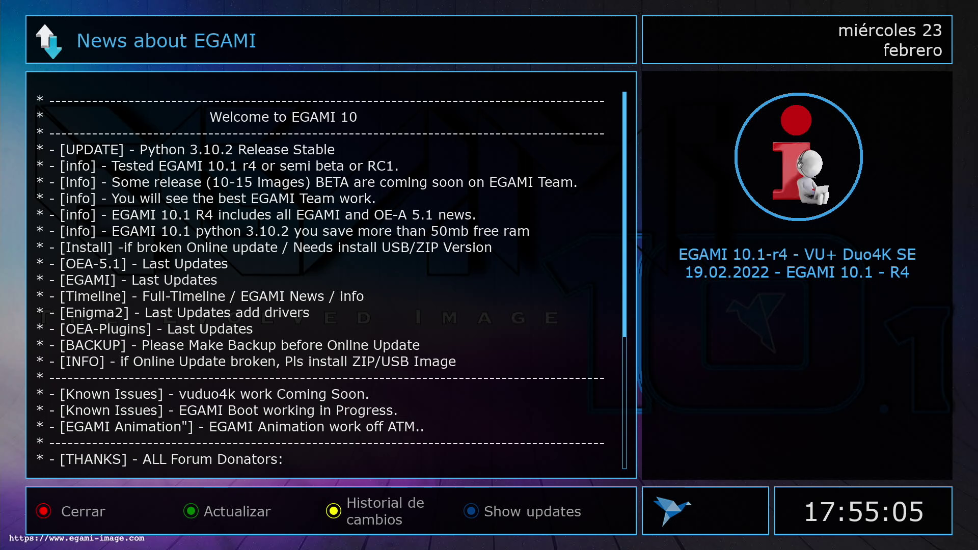 Egami 10.1 es la nueva imagen para receptores enigma2 que ha sacado version bajo python 3, pero en esta ocasion compilada bajo oe-alliance 5.1 con las nuevas versiones python, en este caso se ha actualizado a python 3.10.2, en las versiones actualizadas Egami 10.1 R4, asi como ahora ya esta disponible en descargas y perfectamente funcionando kodi 20.