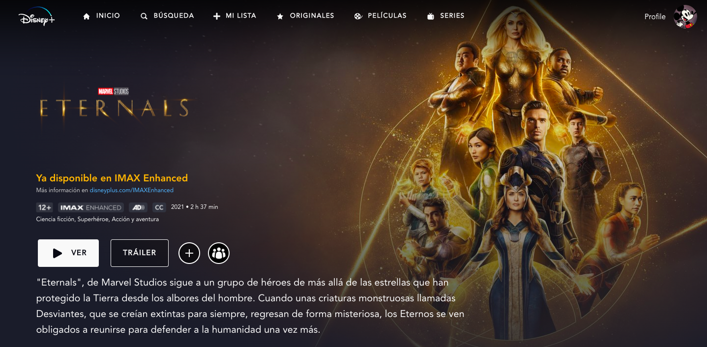 Eternals se une a otras 13 películas del Universo Cinematográfico de Marvel que se emiten en IMAX Enhanced en Disney+, una función que permite a los espectadores ver determinadas películas en una relación de aspecto ampliada, siendo la sipnosis de esta nueva entrega que hace millones de años, los seres cósmicos conocidos como los Celestiales comenzaron a experimentar genéticamente con los humanos. Su intención era crear individuos superpoderosos que hicieran únicamente el bien, pero algo salió mal y aparecieron los Desviantes, destruyendo y creando el caos a su paso. Ambas razas se han enfrentado en una eterna lucha de poder a lo largo de la historia. En medio de esta guerra, Ikaris y Sersi tratarán de vivir su propia historia de amor.