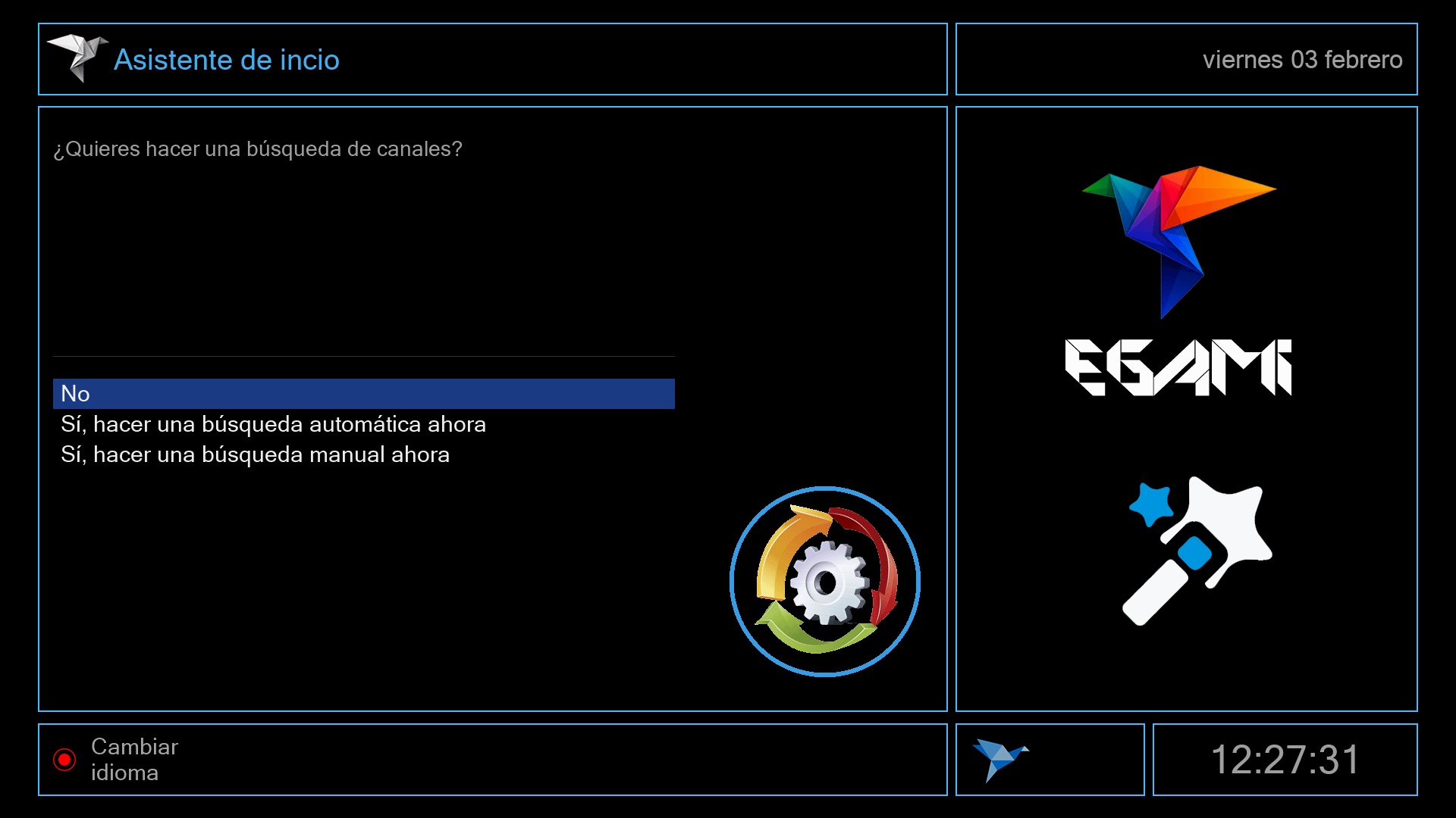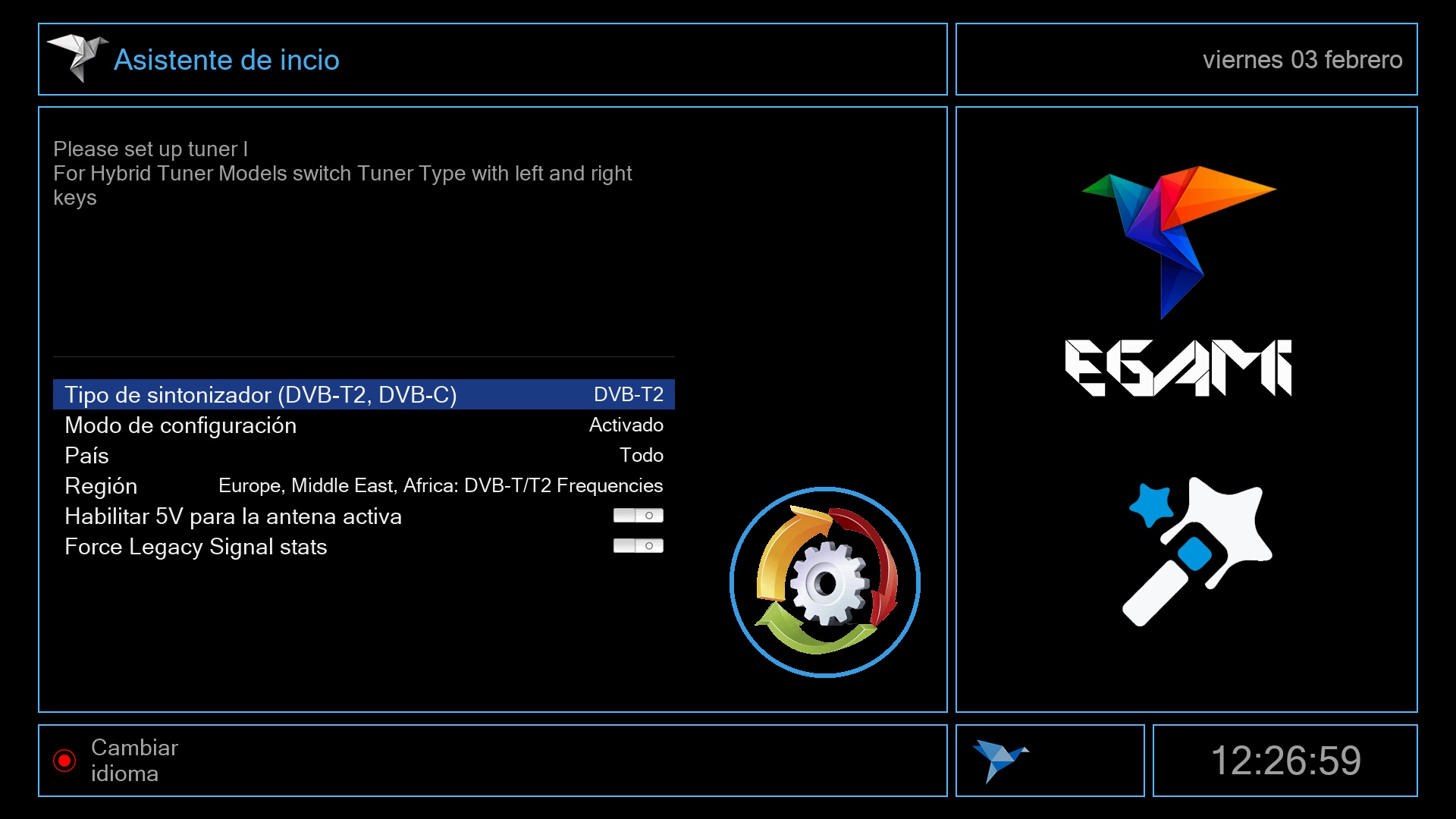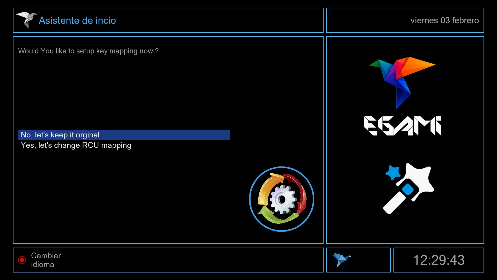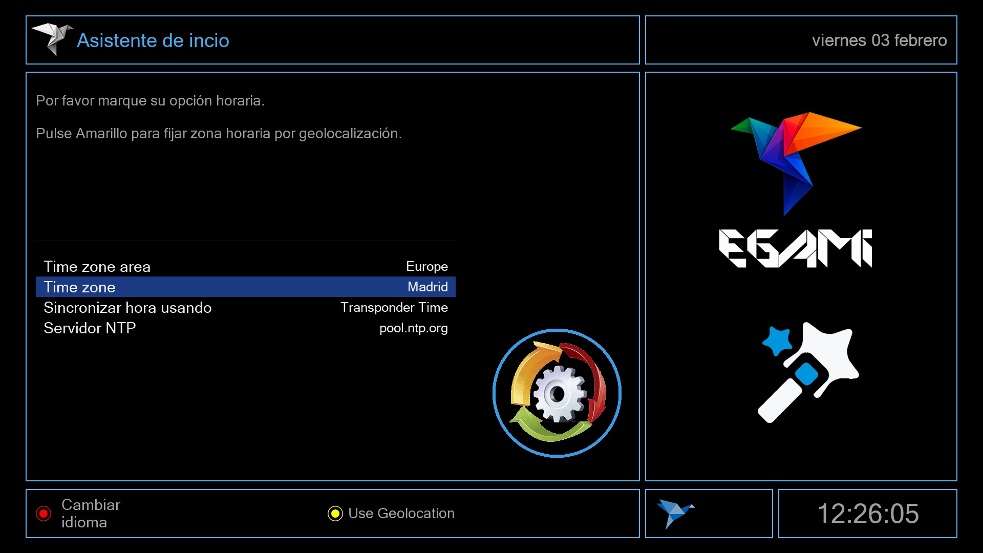 Tras realizar la instalacion de EGAMI en nuestro receptor lo primero que nos aparecera sera un wizard para realizar una primera configuracion de ciertas partes del sistema (que si lo deseamos podremos modificar despues en los distintos menus de la imagen), es un proceso guiado y facil solamente debemos seguir los pasos indicados:
