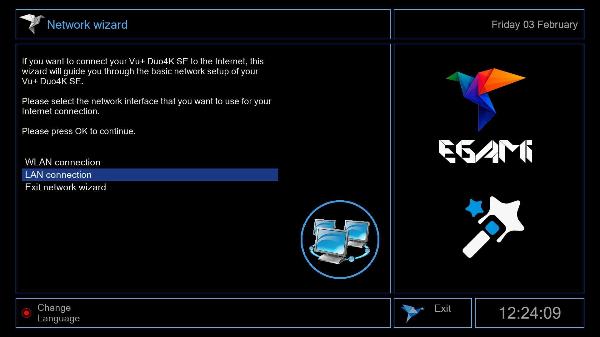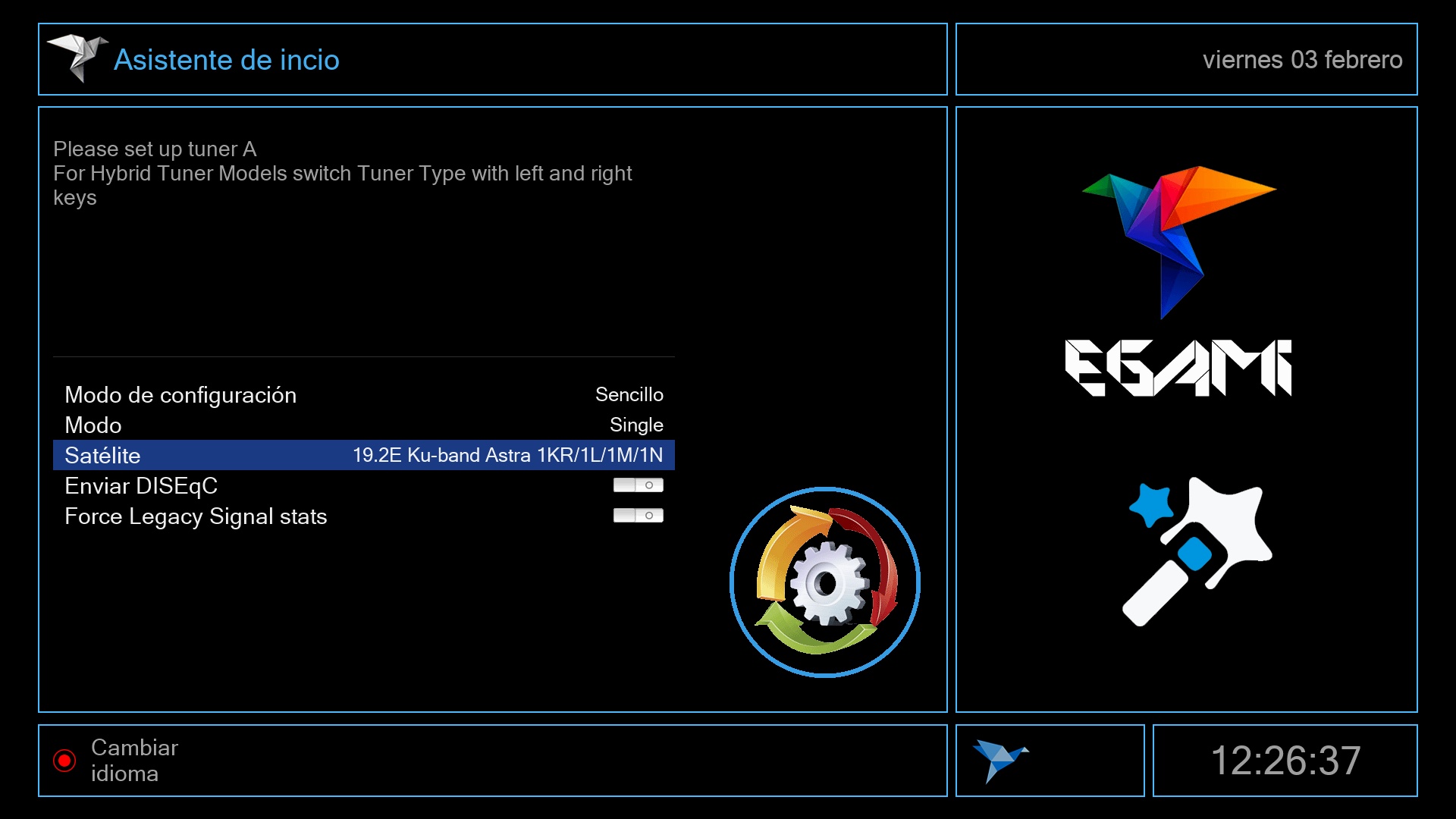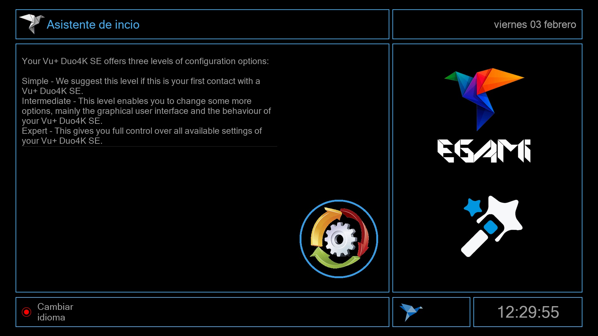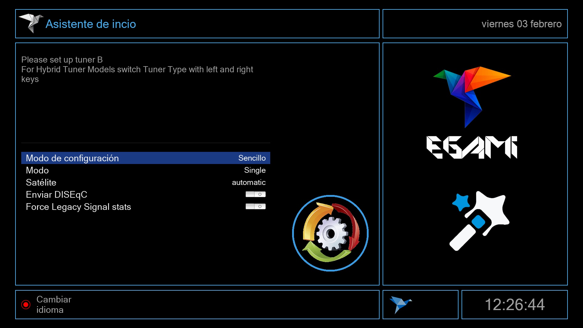 Tras realizar la instalacion de EGAMI en nuestro receptor lo primero que nos aparecera sera un wizard para realizar una primera configuracion de ciertas partes del sistema (que si lo deseamos podremos modificar despues en los distintos menus de la imagen), es un proceso guiado y facil solamente debemos seguir los pasos indicados:
