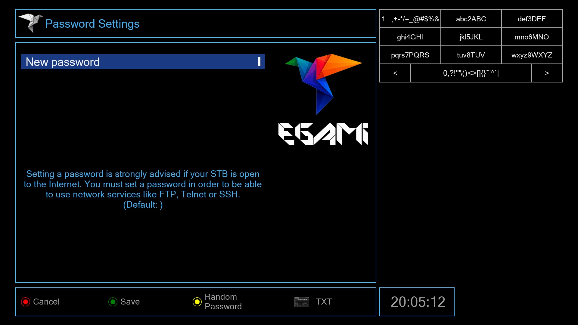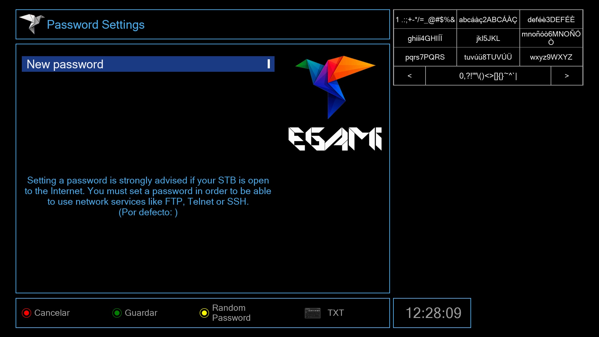 9. Egami no tiene contraseña por defecto, si lo deseamos le asignamos una password de acceso al receptor