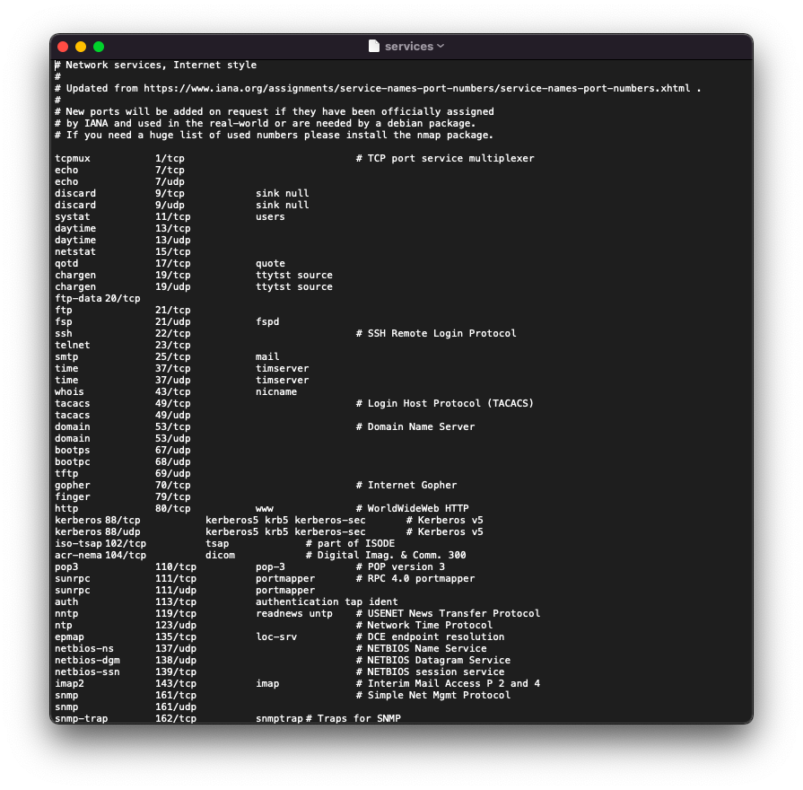 Ademas tambien en el archivo /etc/services en cada línea de este fichero se especifican el nombre, número de puerto, protocolo utilizado y aliases de todos los servicios de red existentes.