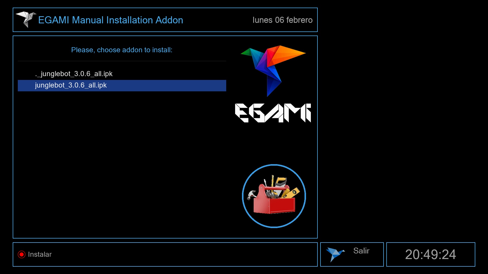 En los repositorios de la imagen EGAMI o en el caso que añadamos un repositorio que contenga lista canales tenemos acceso a su instalacion a traves del menu + complementos + boton rojo: