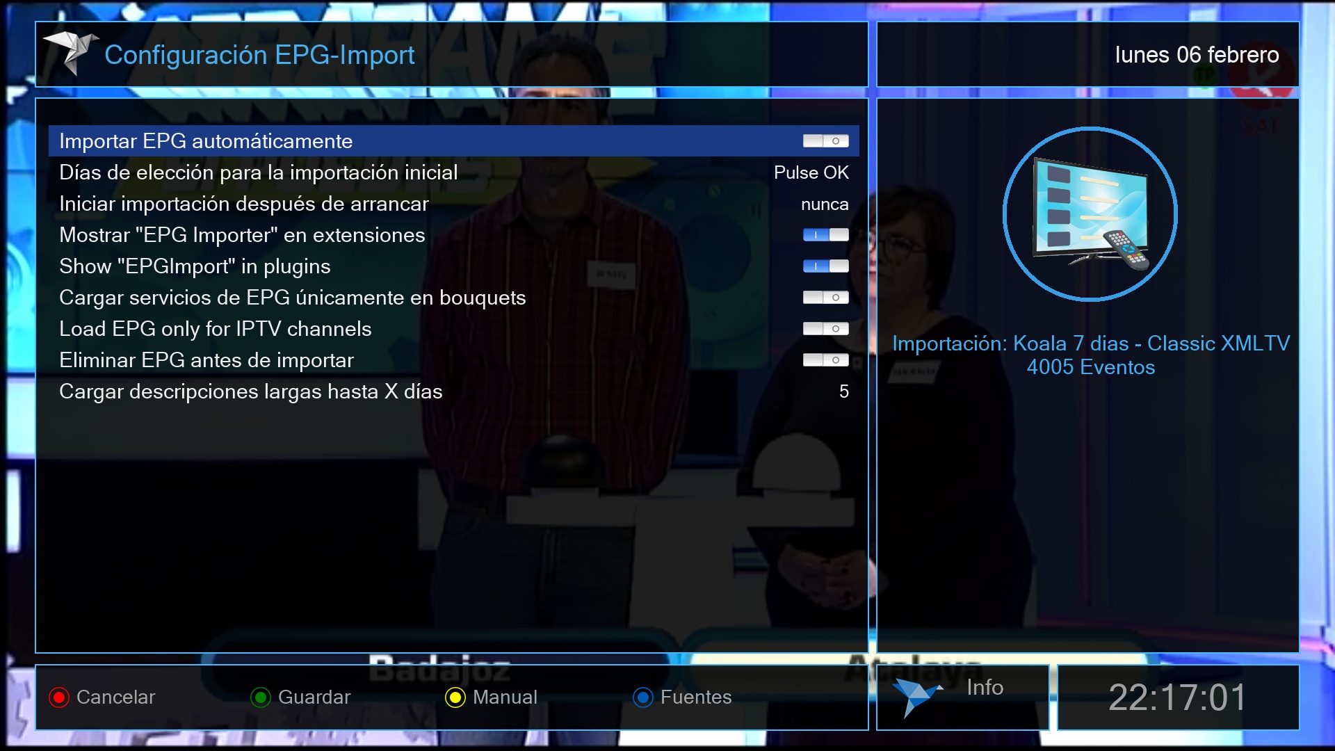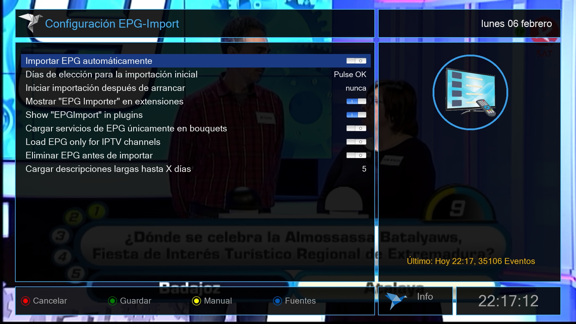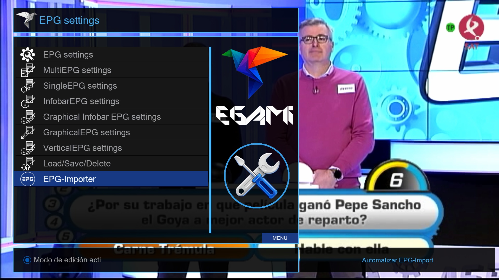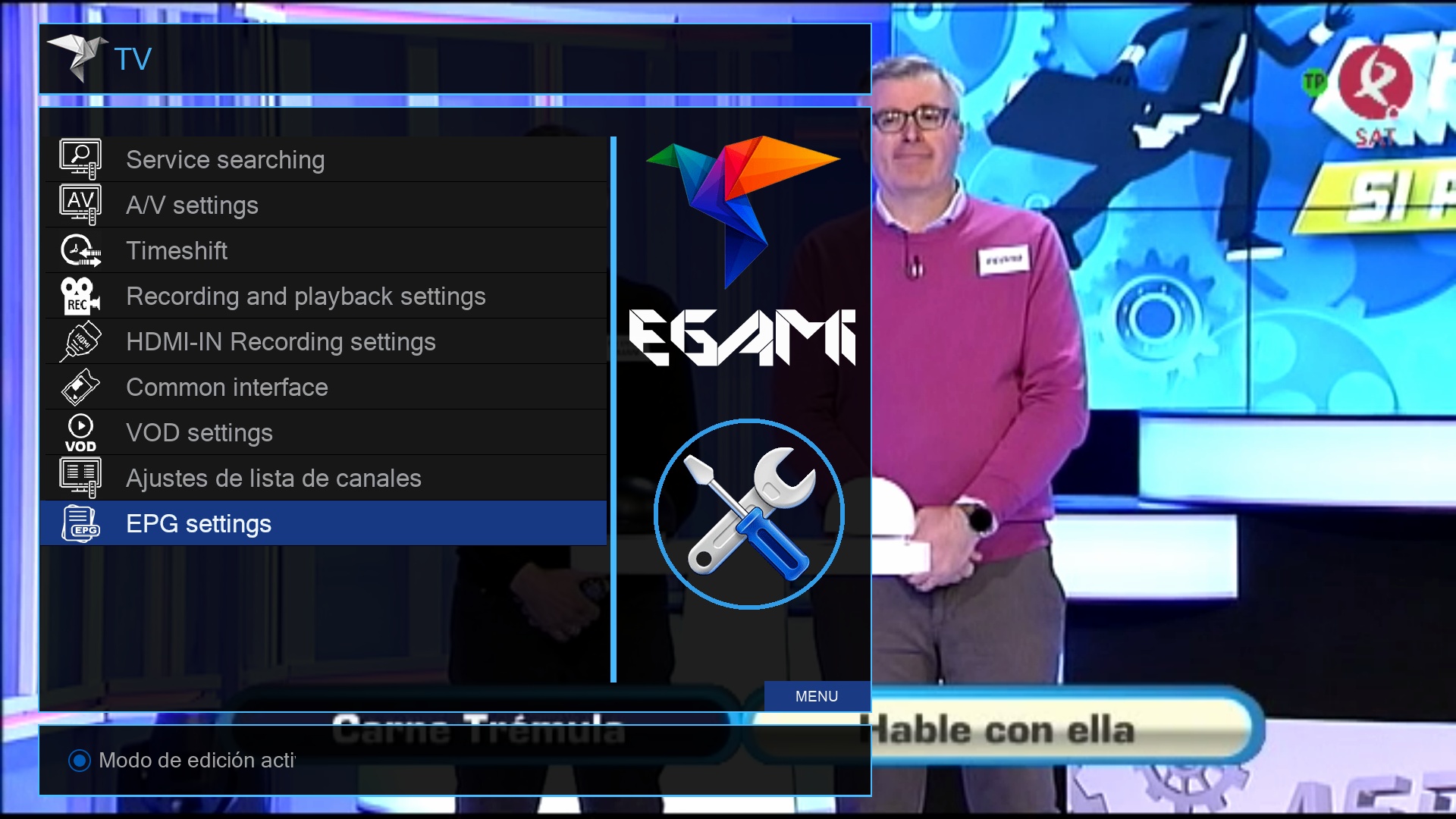 Para tener el epg de los canales en nuestra imagen EGAMI podemos usar EPGIMPORT que esta instalado por defecto, para ello accedemos en menu + configuracion + sistema + TV + epg settings