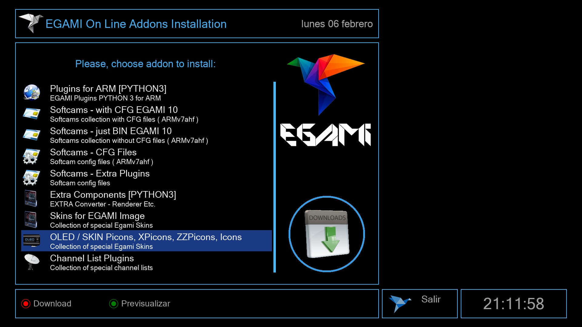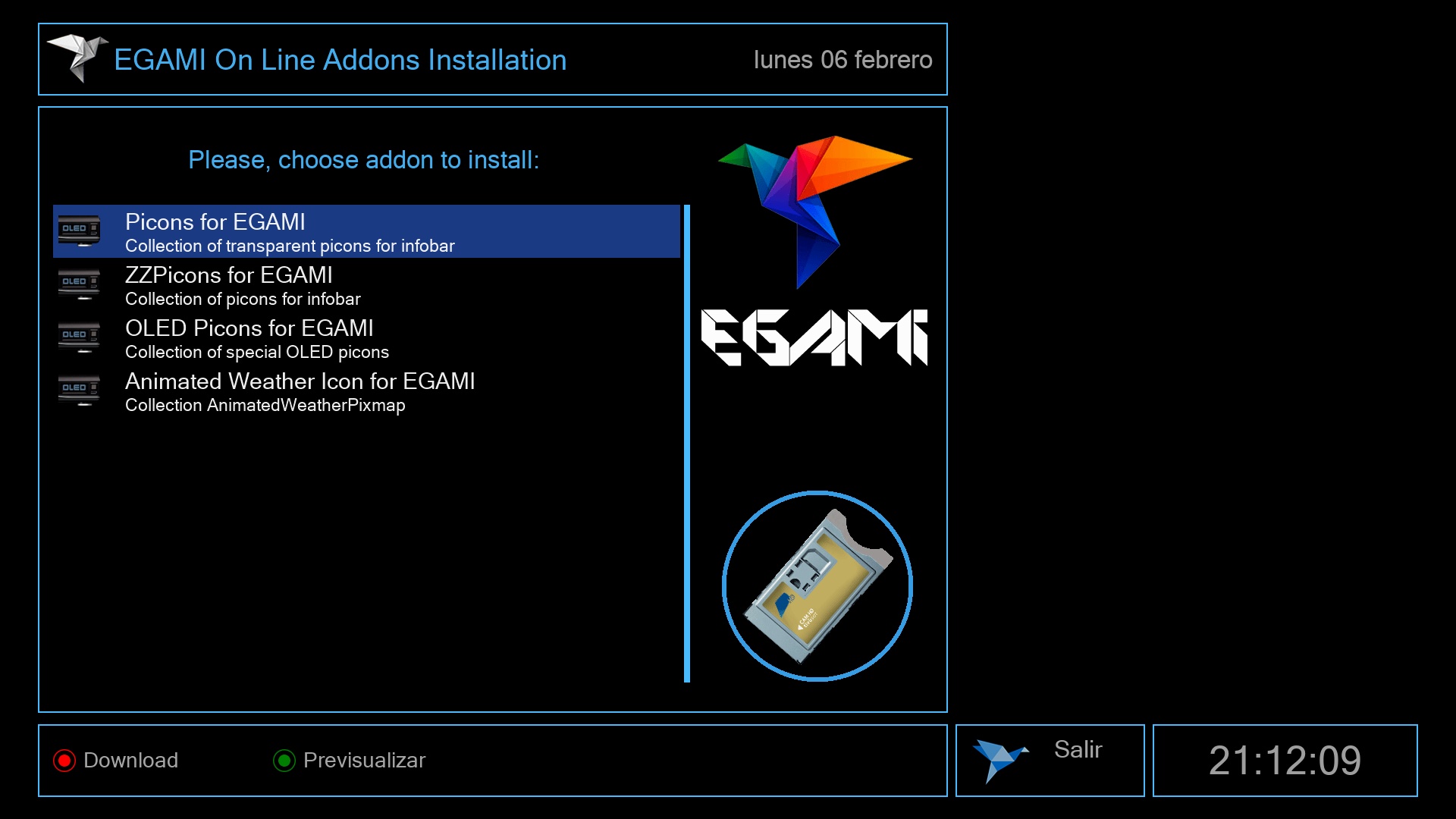 Estos picones los podemos instalar manualmente una vez descargados del algun sitio de terceros o a traves de n ipk desde repositorios, para ello menu + complementos + boton rojo + EGAMI ADDONS + picons
