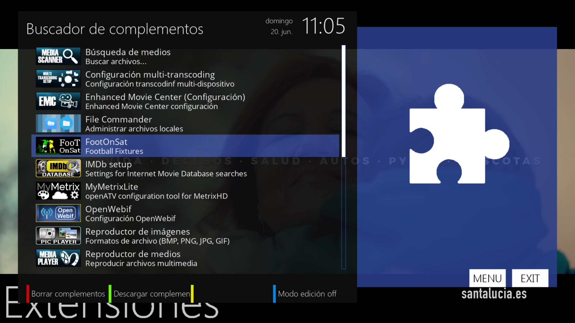 Una vez realizada la instalacion en este ejemplo en imagen OpenATV podemos acceder al plugin pulsando sobre menu + complementos + FootOnSat