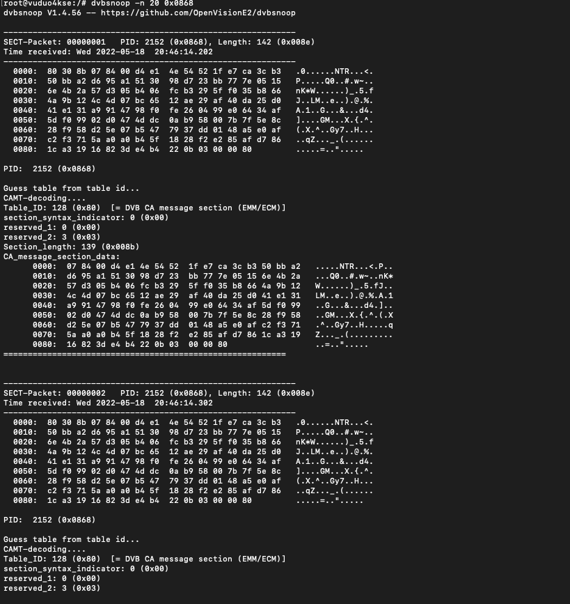 Podemos ver logueando el pid del canal el transito de paquetes ecm dentro del flujo ts, donde los paquetes ecm normalmente comienzan por 80 y 81: