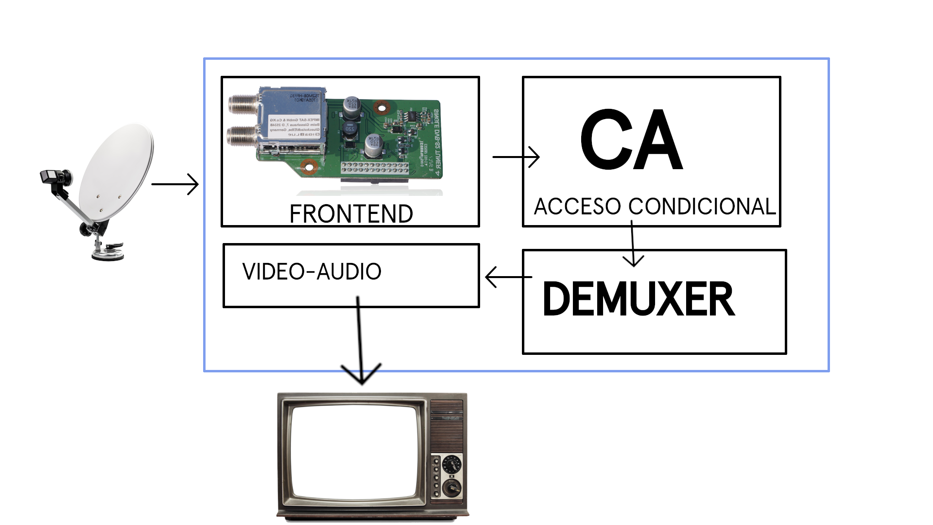 - CAS: Acceso condicional donde se ubica el acceso a nuestra tarjeta de abonado, el flujo proveniente del frontend, en el caso que sea de una plataforma de pago, el video y audio viene cifrado, estos datos son descifrados por la tarjeta de abonado y se reinsertan ya descifrados en el flujo ts.